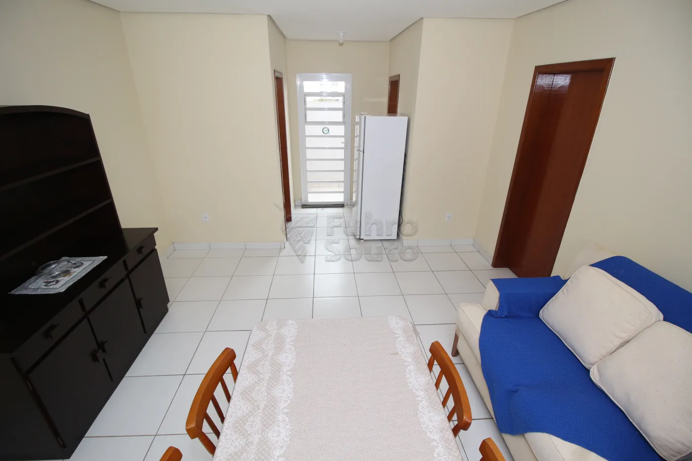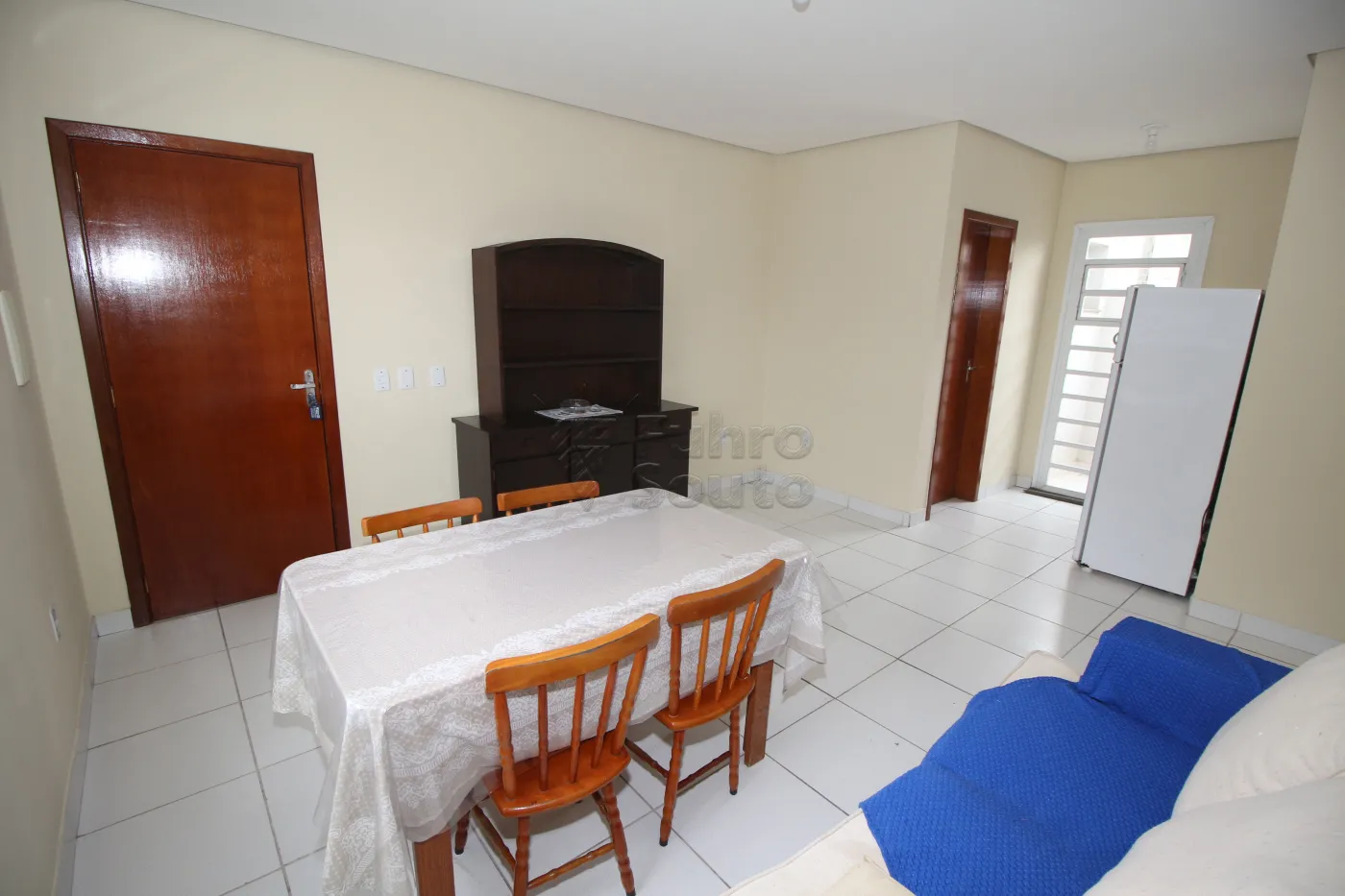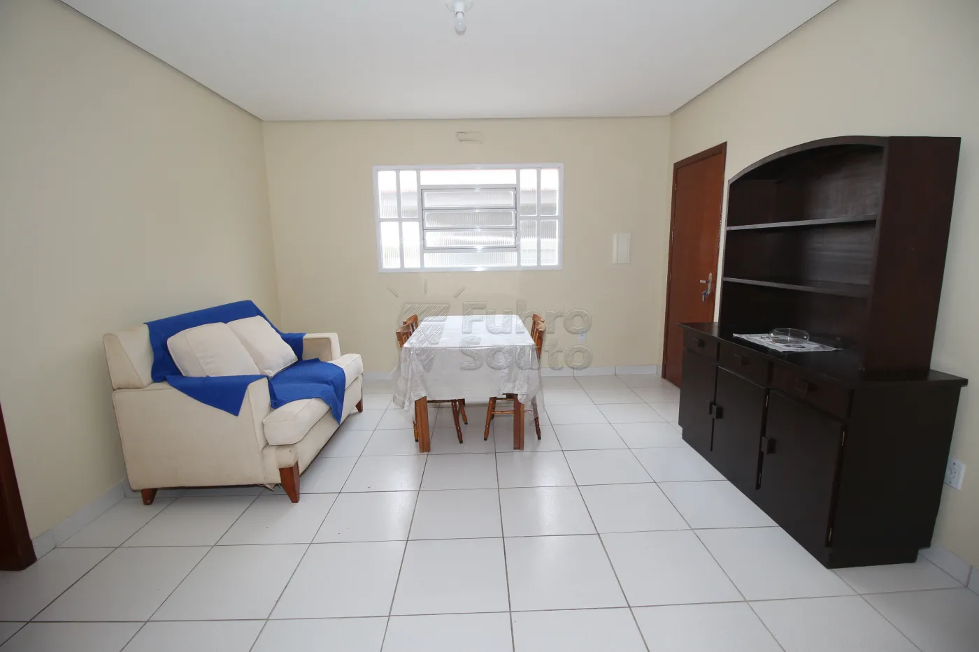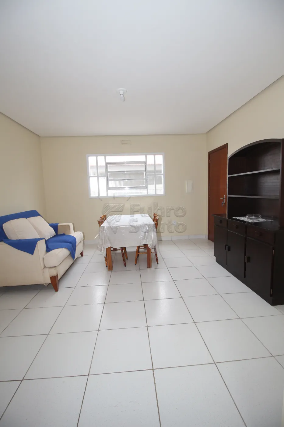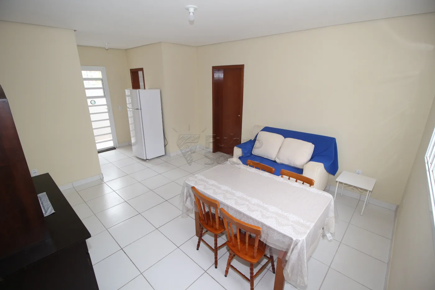 - Sala Ampla em Piso Frio: Espaçosa e aconchegante, a sala conta com sofá, mesa grande com 4 cadeiras e estante.