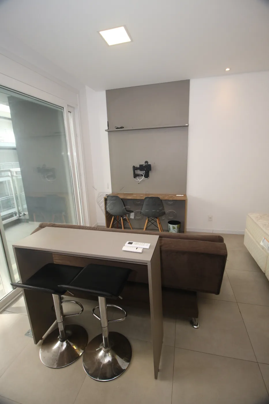 Sala/Quarto Integrado: Ambiente totalmente mobiliado, com móveis planejados, sofá confortável, ar-condicionado, eletrodomésticos modernos e utensílios. O espaço é otimizado, proporcionando um estilo de vida prático e aconchegante.