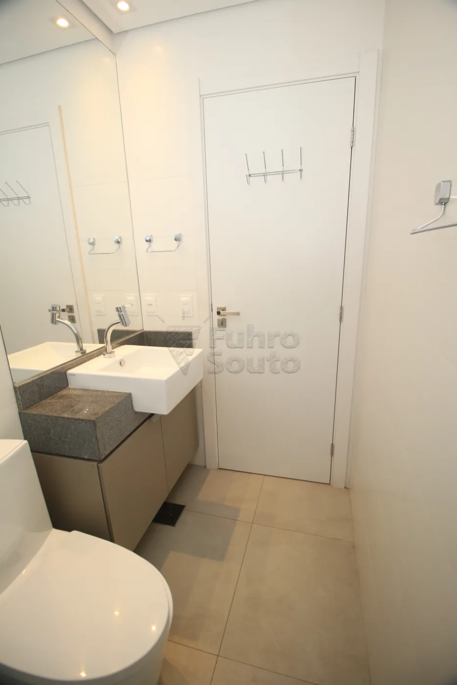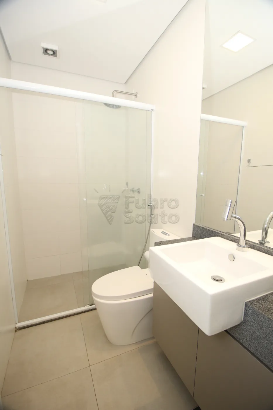 Banheiro: Equipado com box de vidro, armário com cuba, espelho, e acabamento sofisticado, oferecendo um ambiente agradável e funcional.