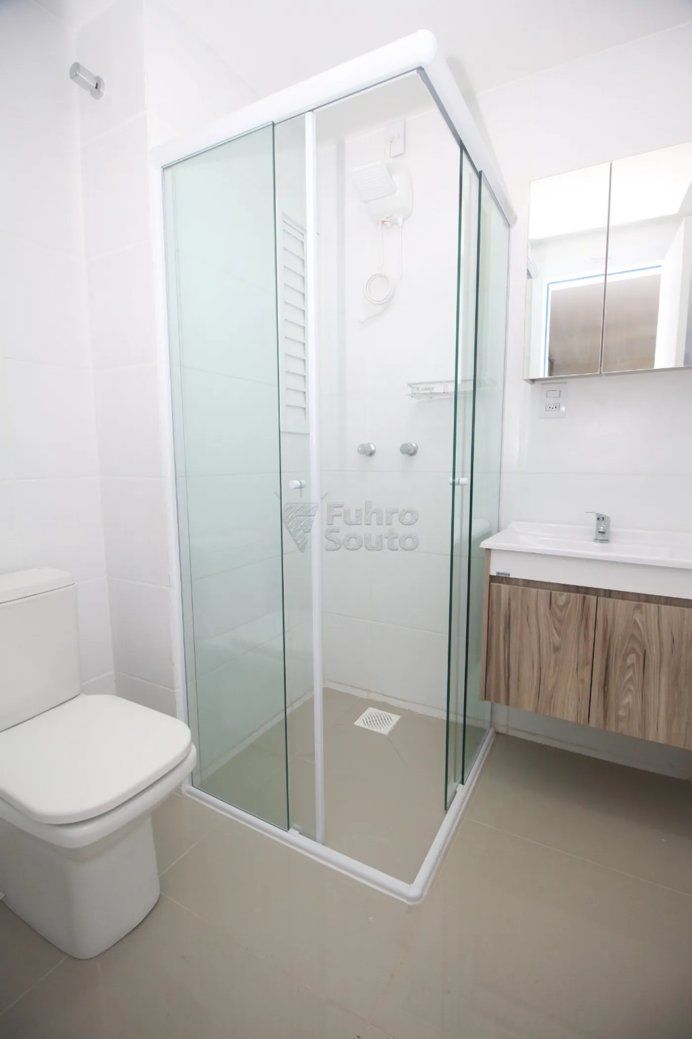 Banheiro moderno, com armário planejado e box de vidro.