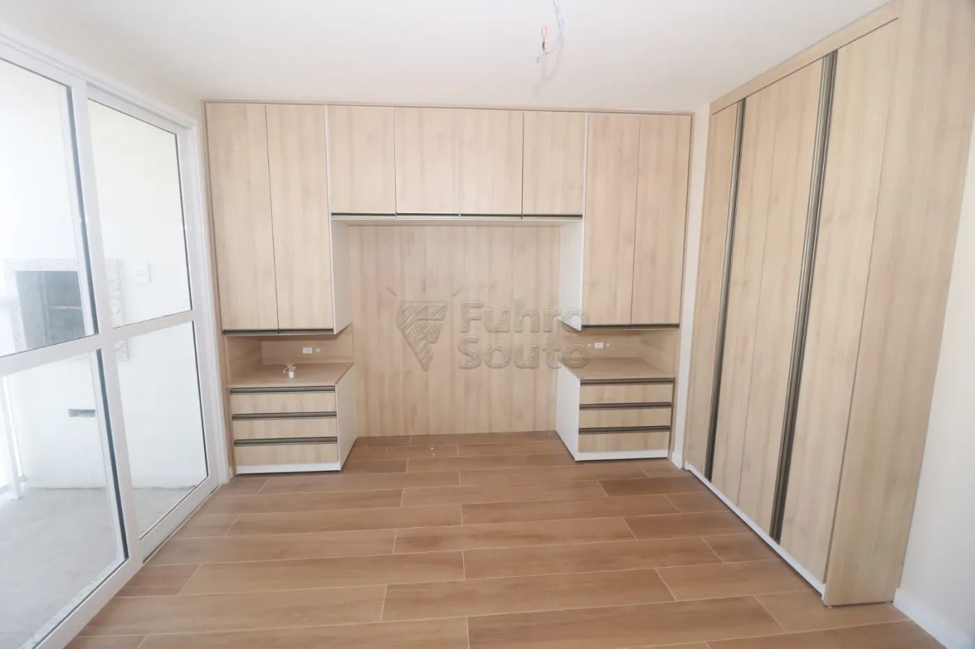 Dormitório com móveis planejados, incluindo roupeiro e criados-mudos integrados, oferecendo organização e conforto.