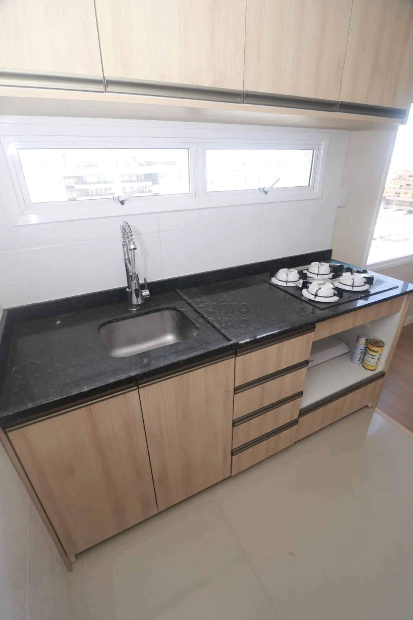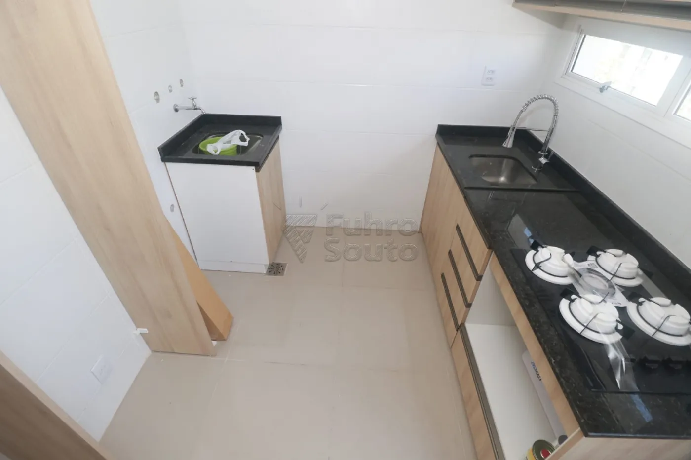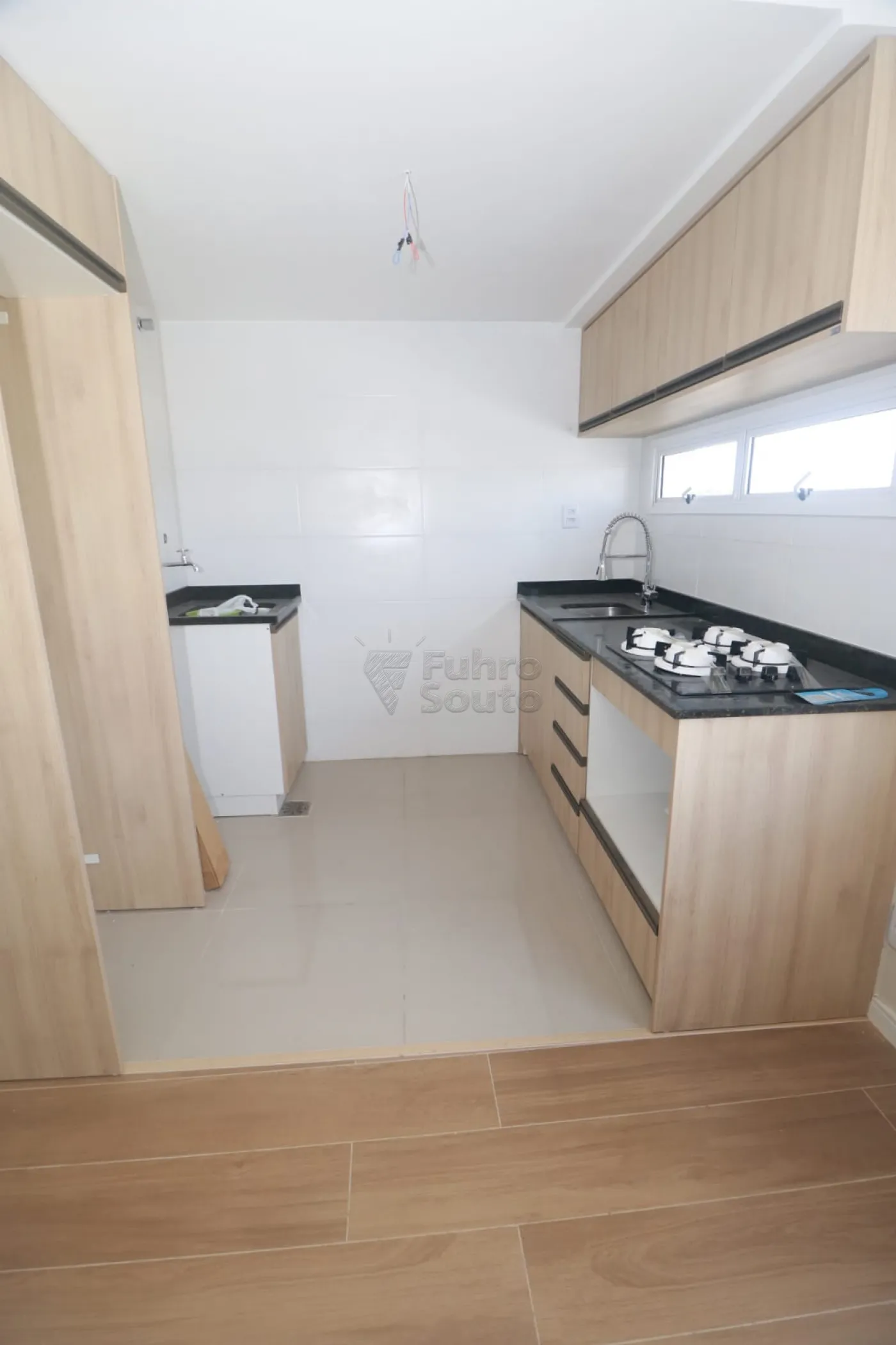 Cozinha funcional com armários planejados, equipada com fogão cooktop, pia e tanque, garantindo praticidade no dia a dia.