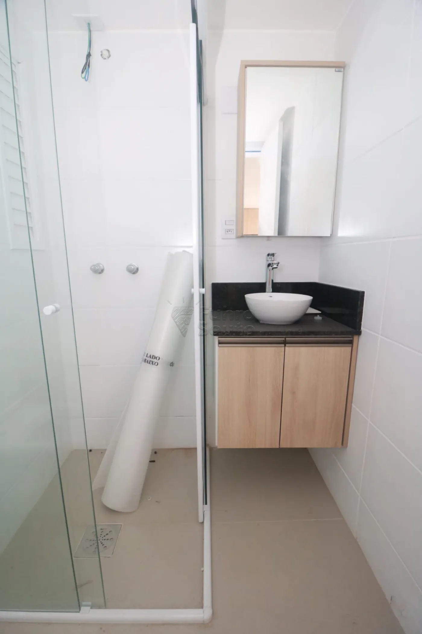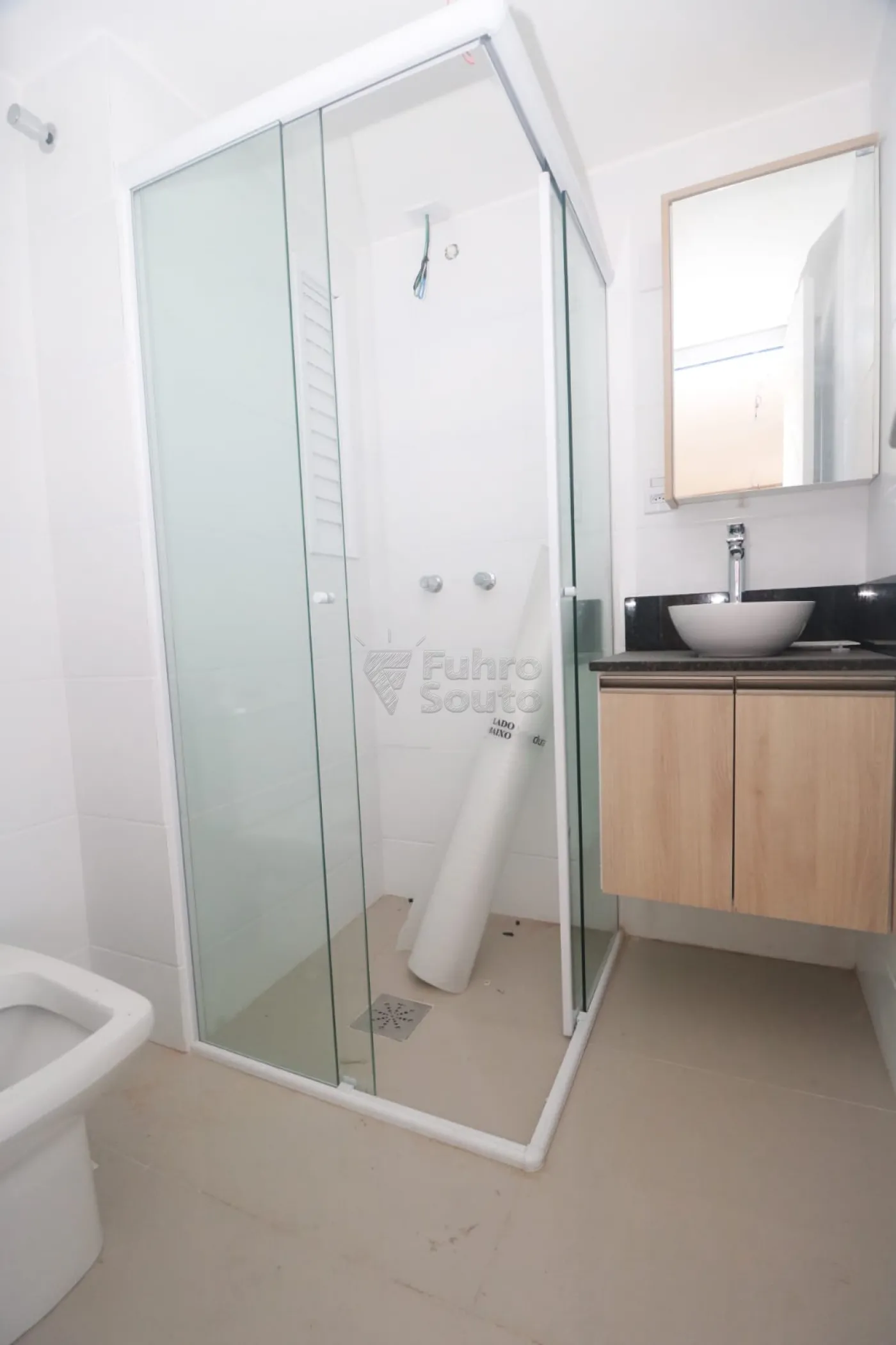 Banheiro com armário planejado e box de vidro, com acabamento moderno.