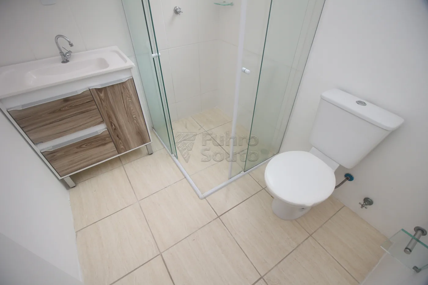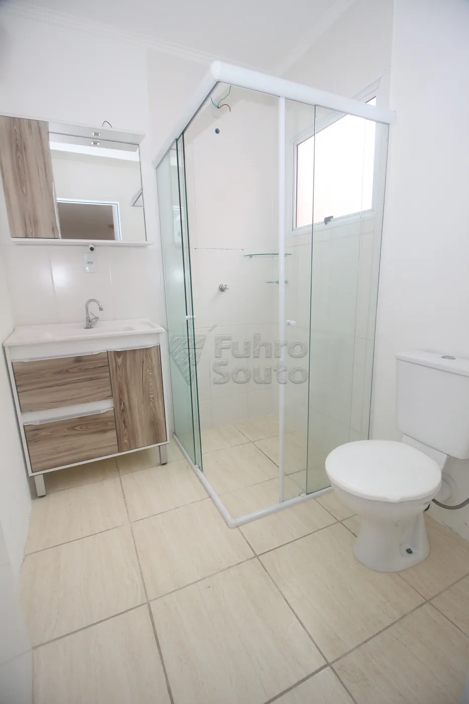 Banheiro com box de vidro, armário com cuba e espelho, garantindo praticidade no dia a dia.