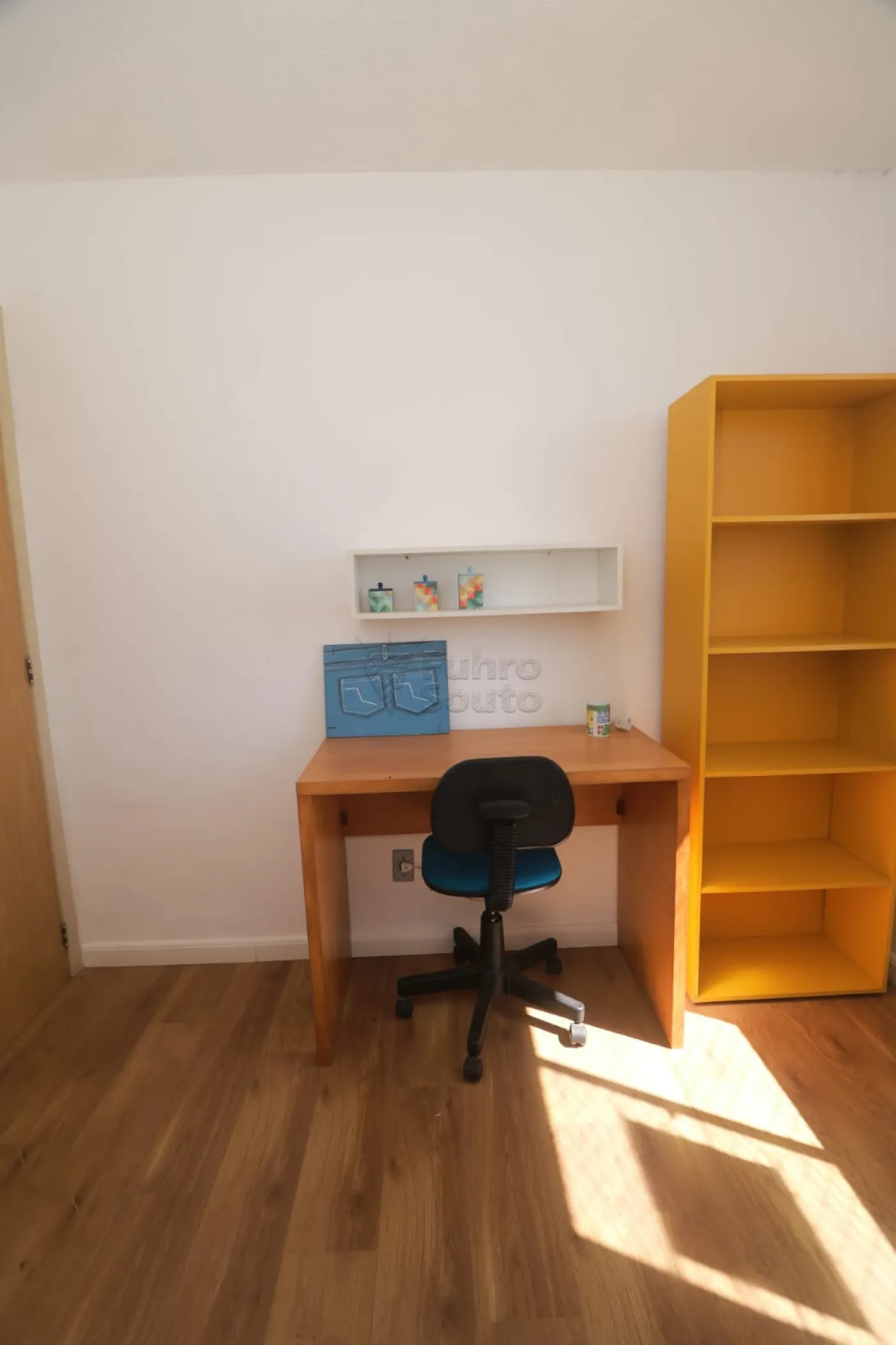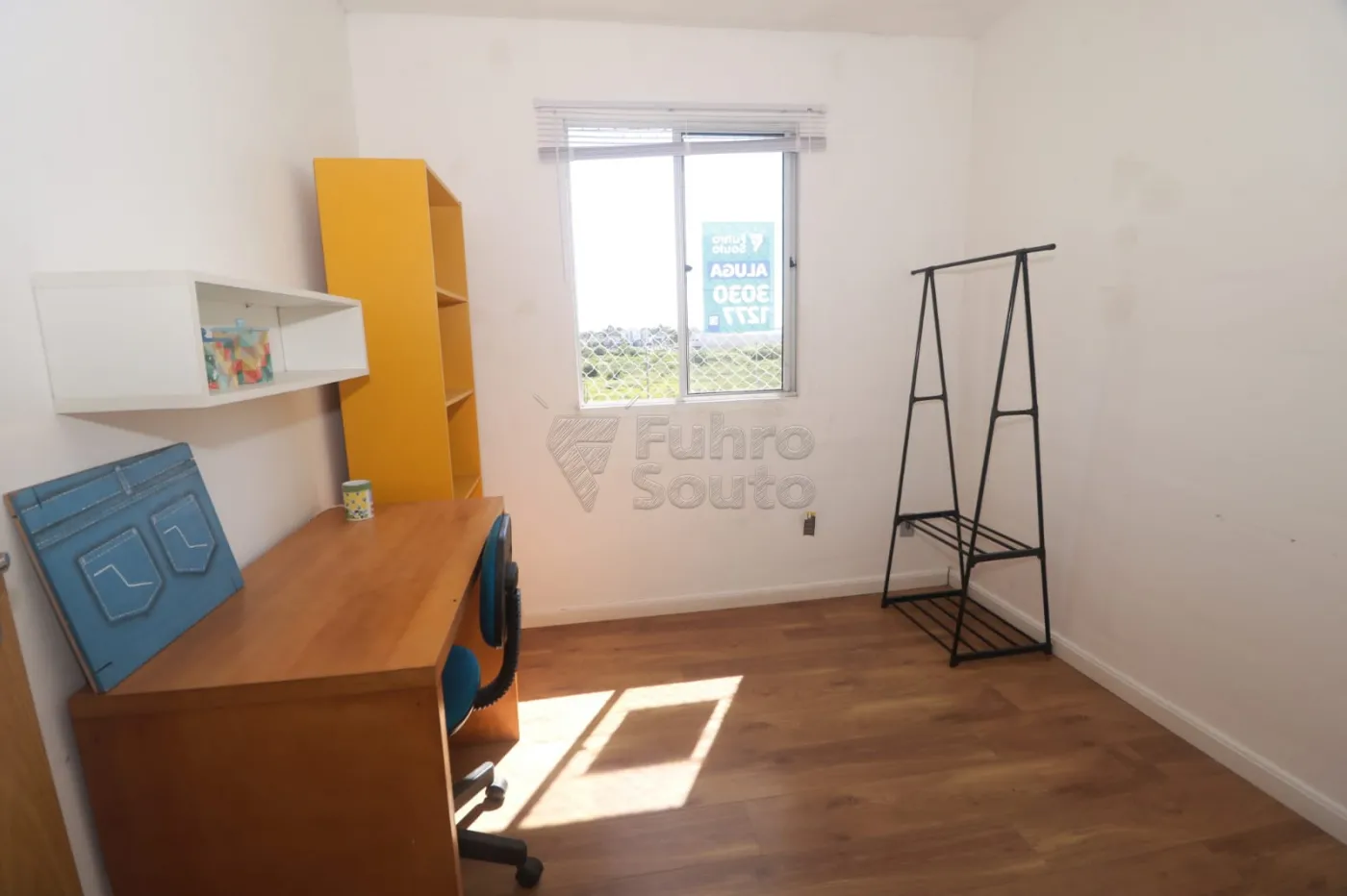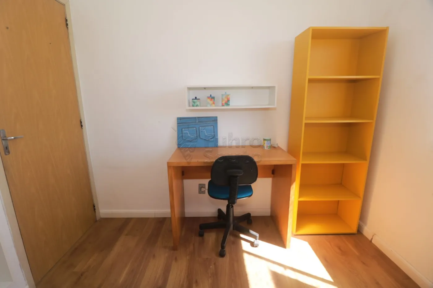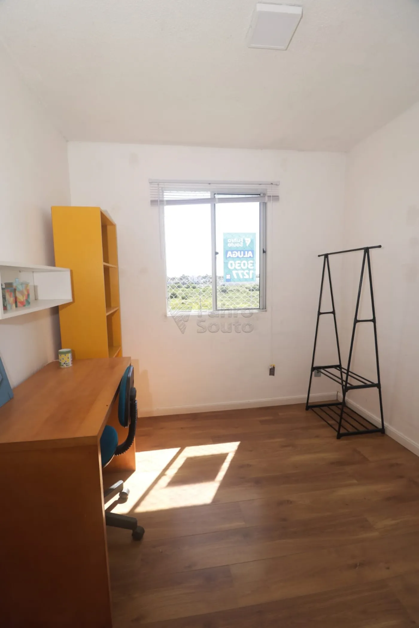 Dormitório secundário (versátil): Um espaço que pode ser utilizado como quarto de solteiro ou escritório. Conta com mesa de estudos, cadeira, arara para organizar roupas e outros objetos, além de uma estante na cor amarela que dá um toque moderno e diferenciado ao ambiente, trazendo personalidade e destaque à decoração.