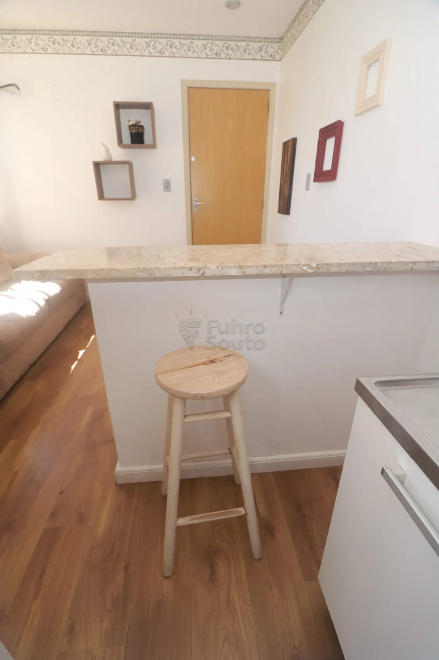 Sala de estar: Ambiente acolhedor e bem aproveitado, com sofá confortável, rack para TV e mesa de apoio. O espaço conta ainda com um balcão que divide a sala da cozinha, criando uma integração moderna entre os ambientes. Esse balcão possui bancos dos dois lados, podendo ser utilizado tanto como apoio para refeições rápidas quanto como espaço de convivência.
