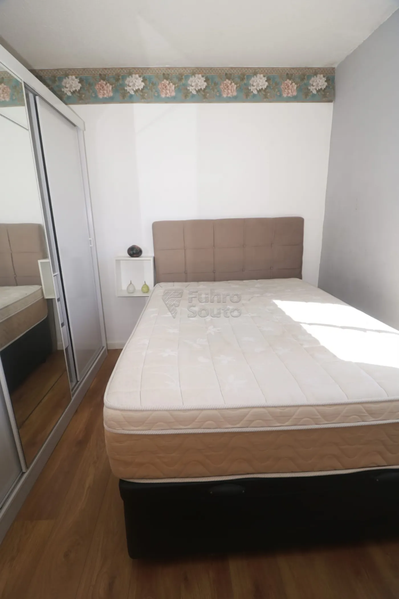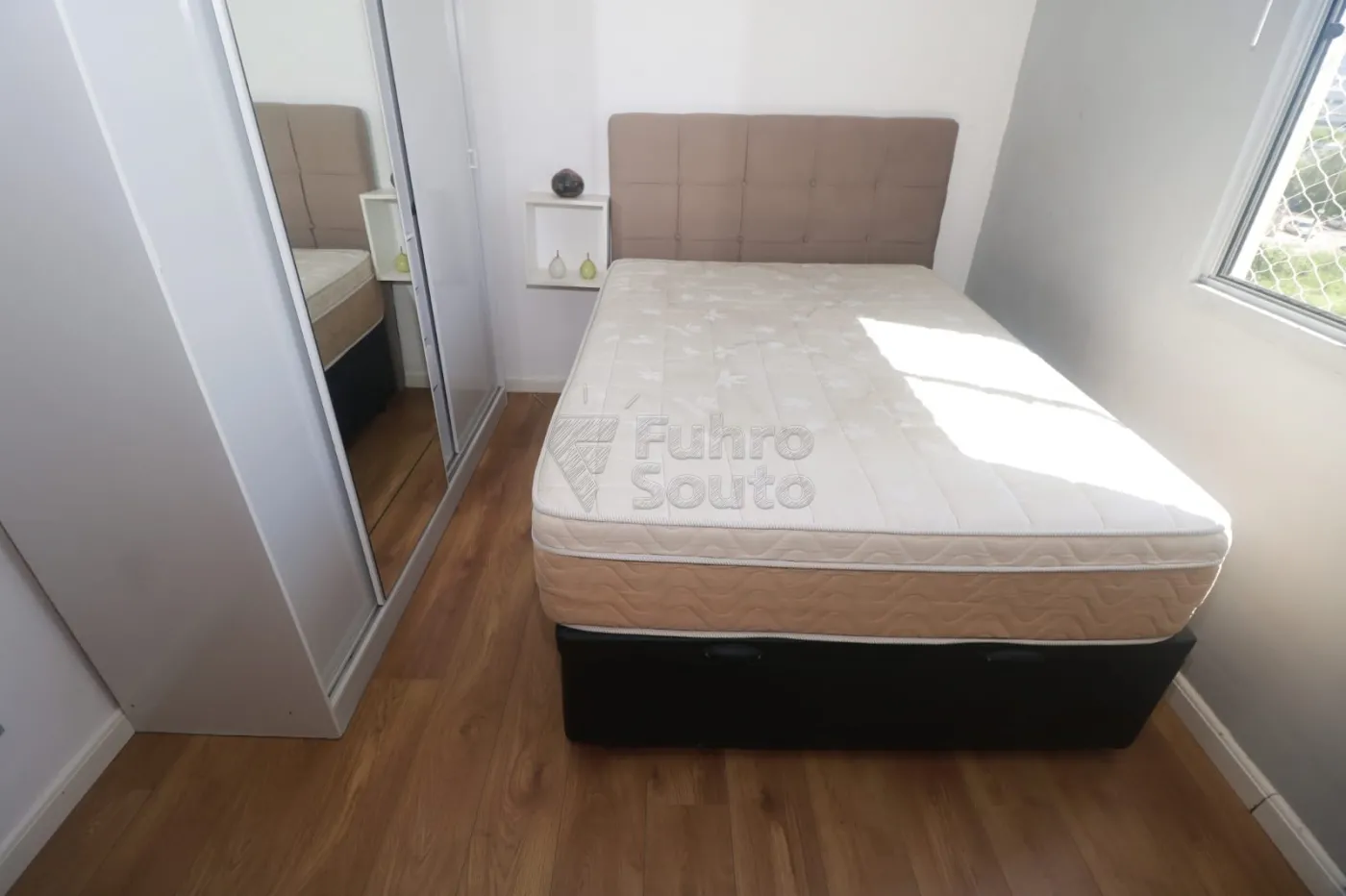 Dormitório principal: Confortável e bem distribuído, possui cama box de casal, roupeiro com espelho (que amplia visualmente o ambiente) e nicho ao lado da cama, ideal para apoio de objetos pessoais, livros ou itens decorativos.