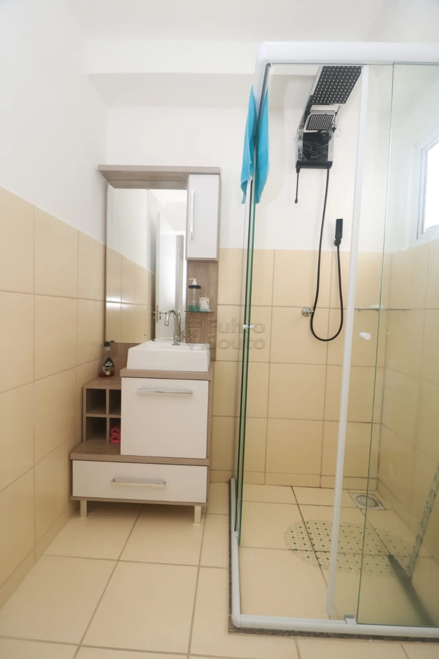 Banheiro com box de vidro, armário com cuba e espelho, trazendo funcionalidade e estilo.