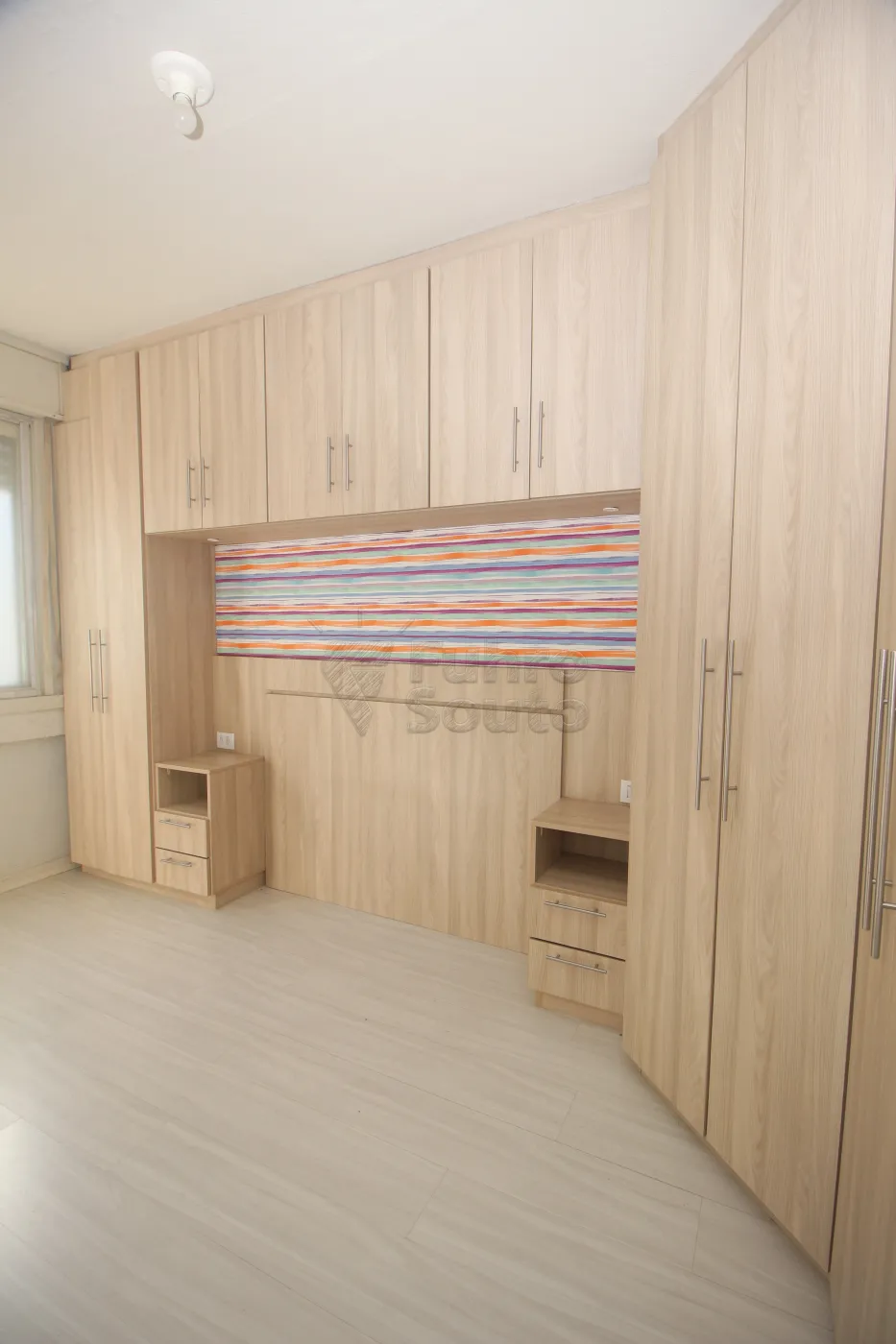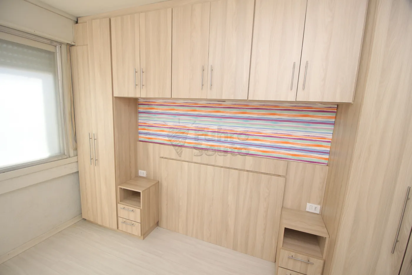 Um dormitório com roupeiro planejado e mesas de cabeceira.