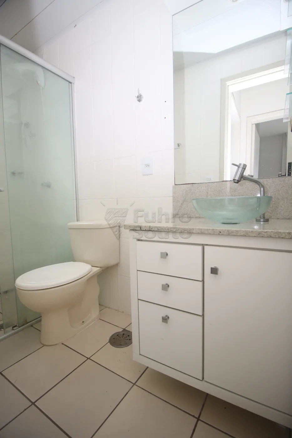 Banheiro social com box de vidro, armário com cuba e espelho.