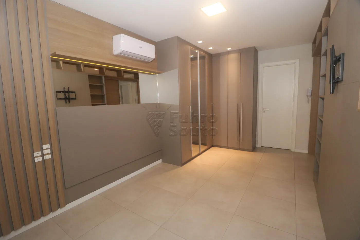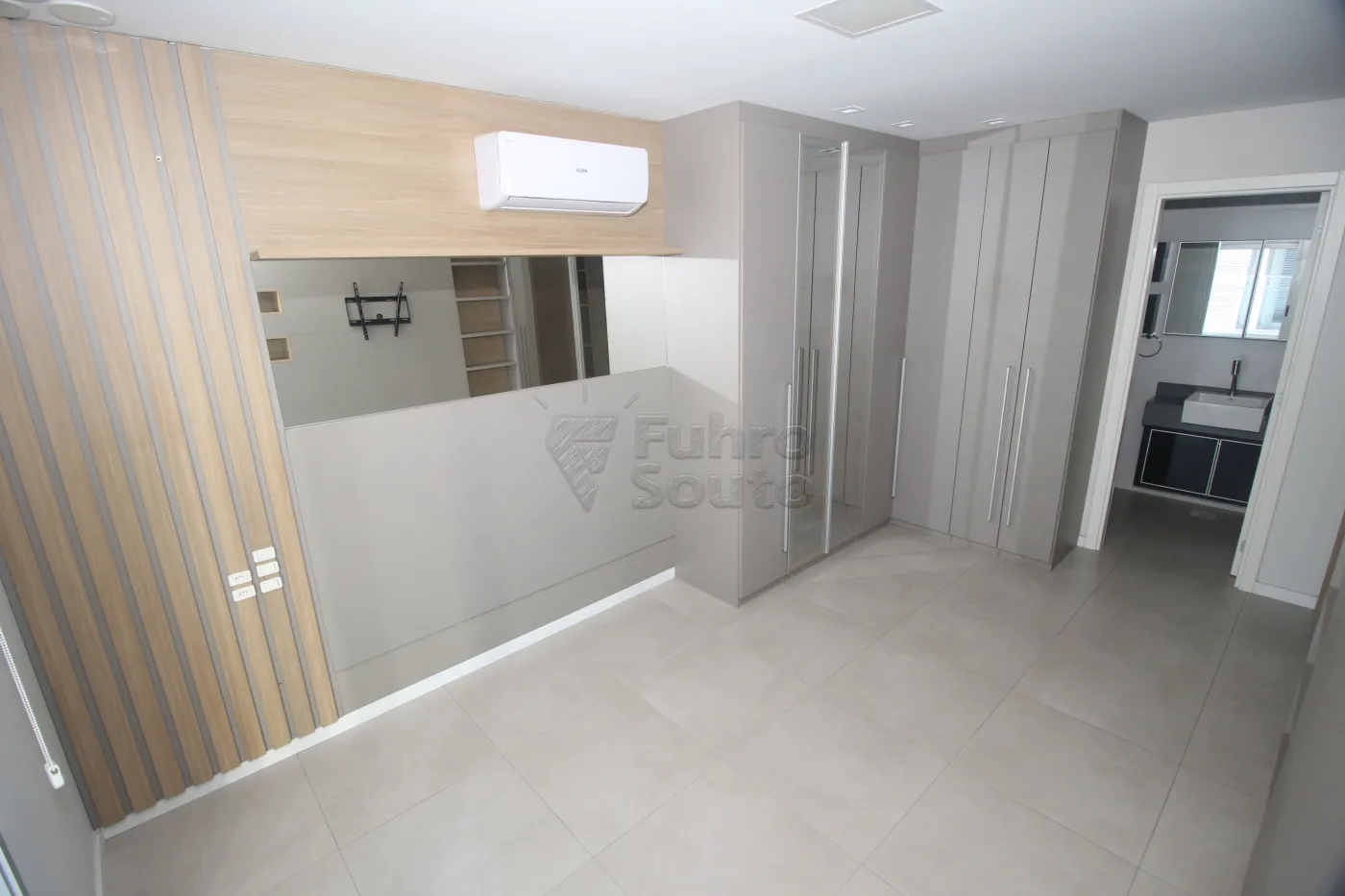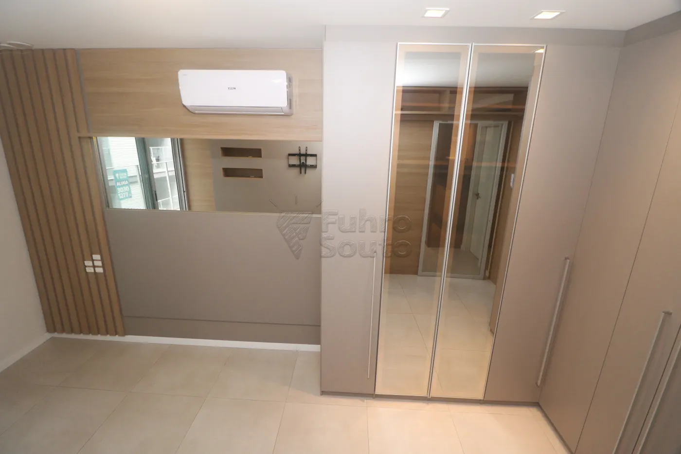 Guarda-roupas planejado com portas espelhadas, agregando funcionalidade e amplitude ao espaço.