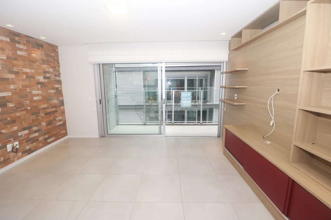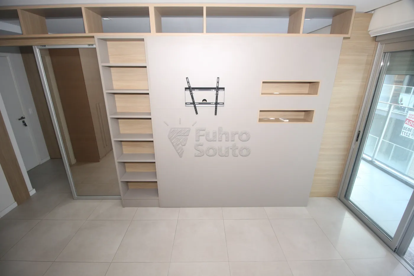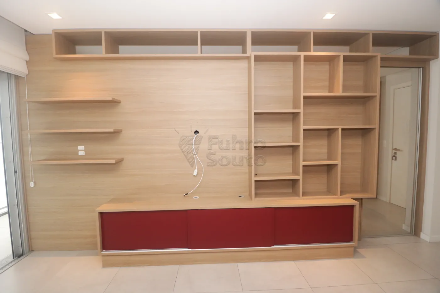 Painel planejado com nichos e espaço para TV, além de armários inferiores amplos.