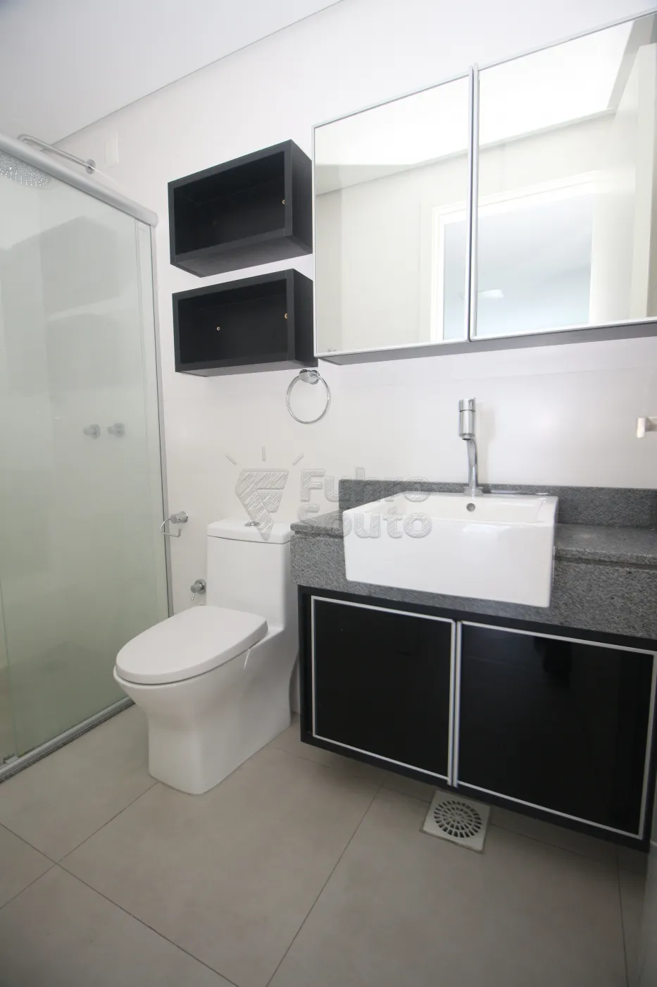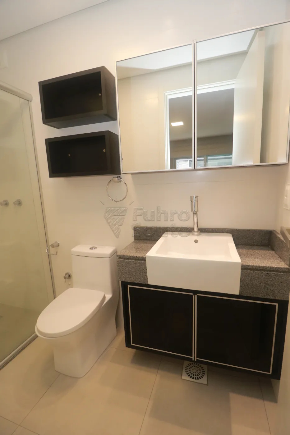Banheiro com box em vidro, bancada em granito, armário e espelho, com acabamento moderno.