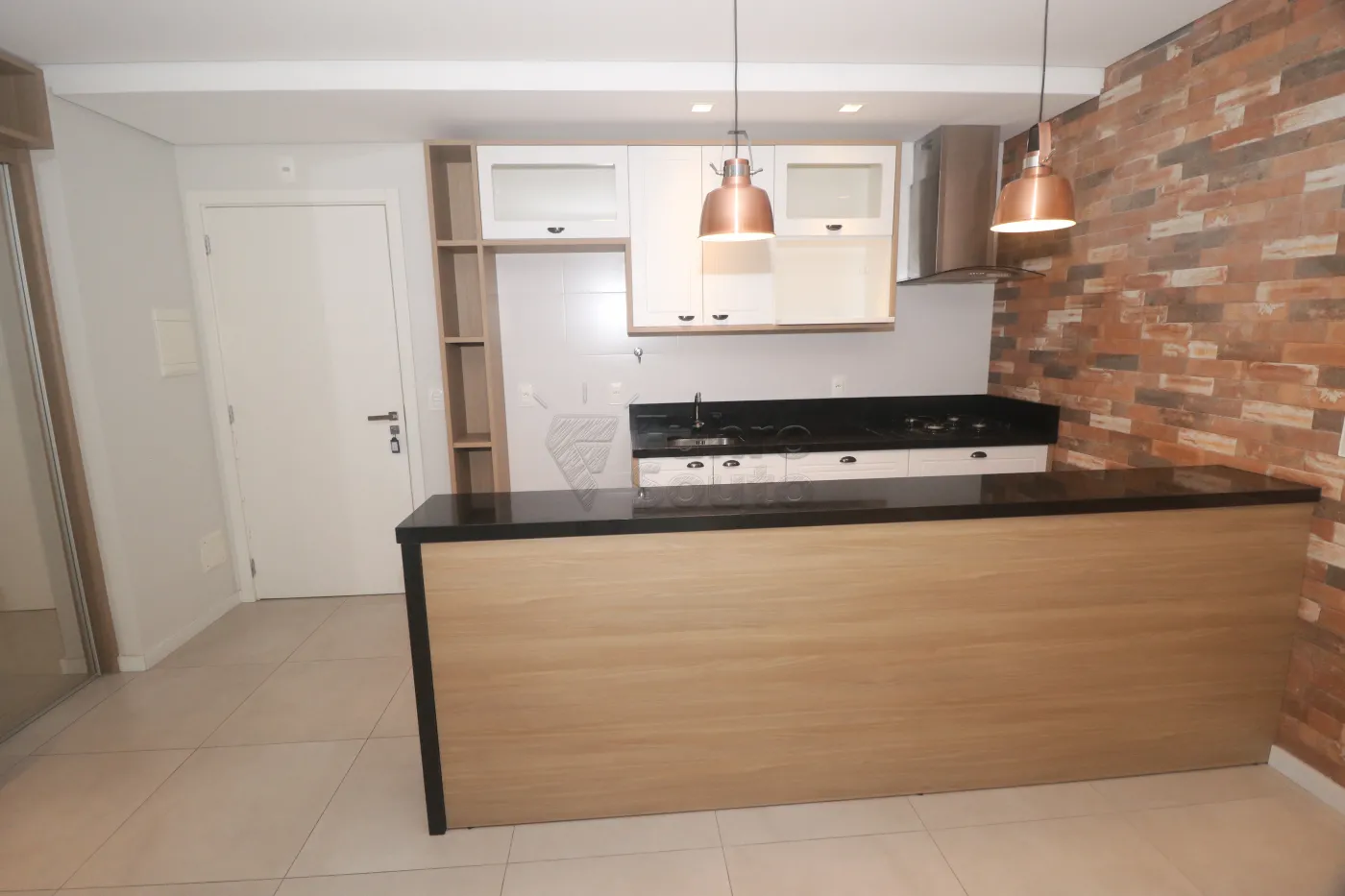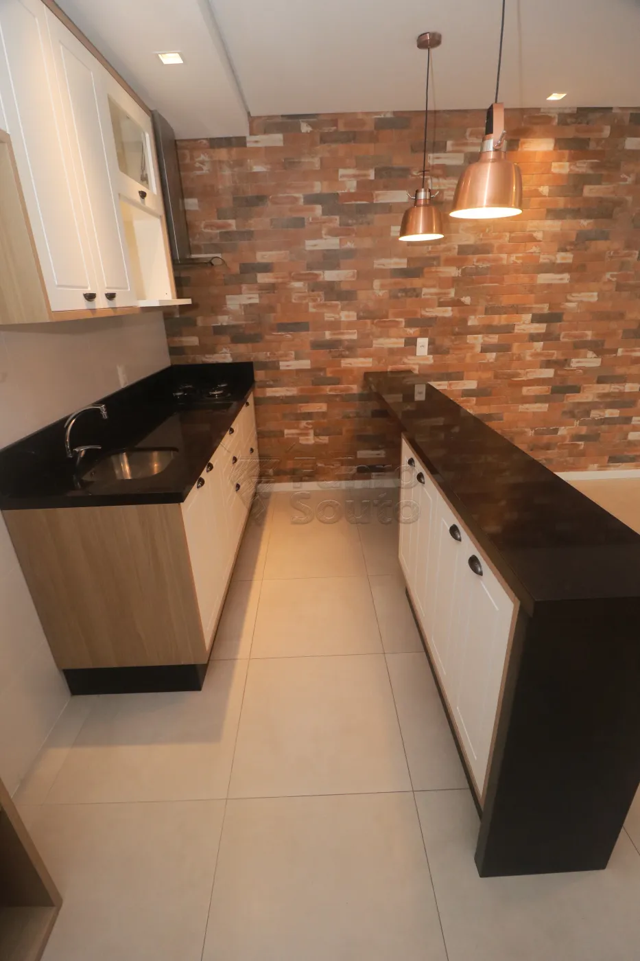 Iluminação pendente moderna sobre a bancada, valorizando o design do ambiente.