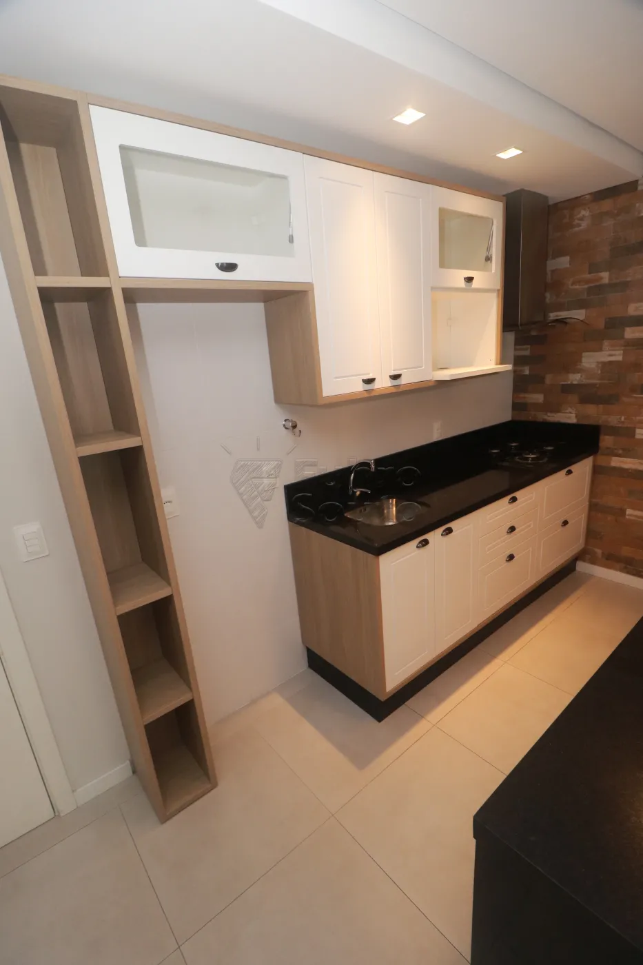 Cozinha planejada com móveis sob medida, bancada em granito preto, cooktop, cuba em inox e ótima área de armazenamento.