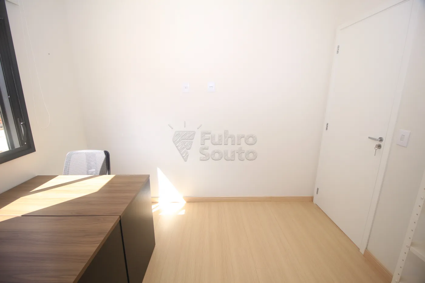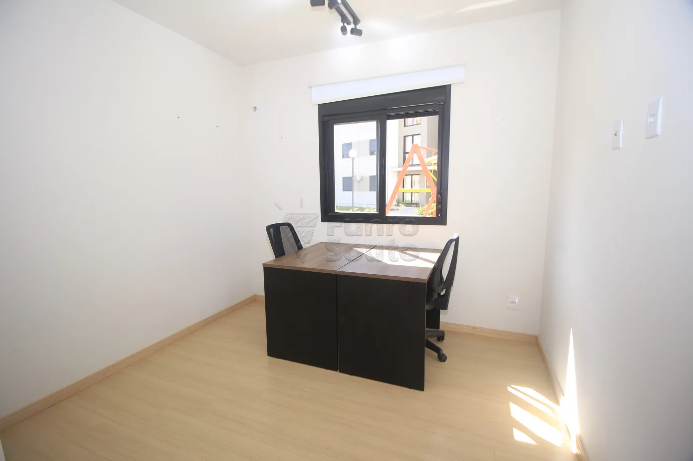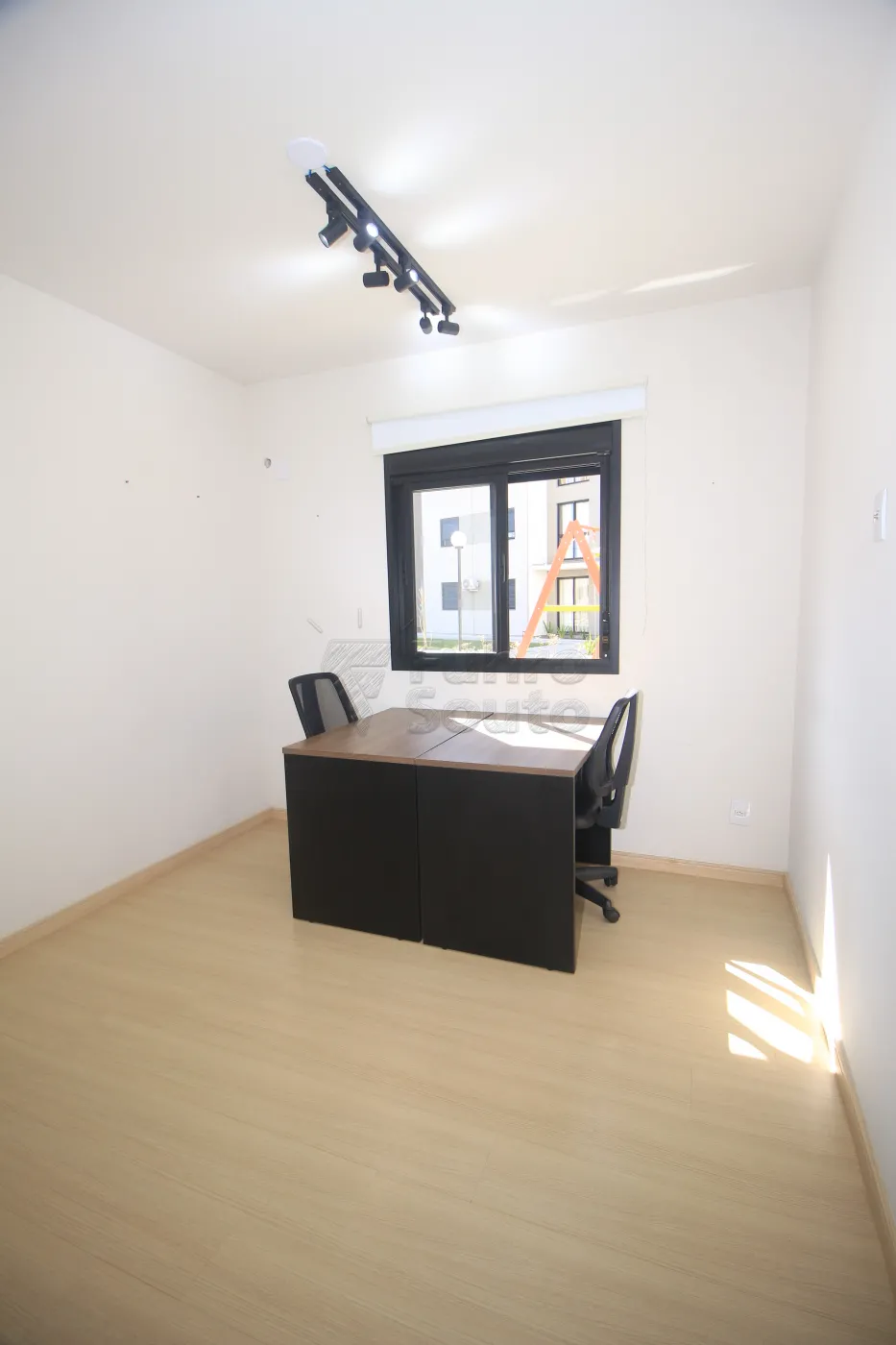 Escritório mobiliado com 2 mesas de trabalho, 2 cadeiras (opcional, podendo ser retiradas), sofá-cama e cortina blackout.