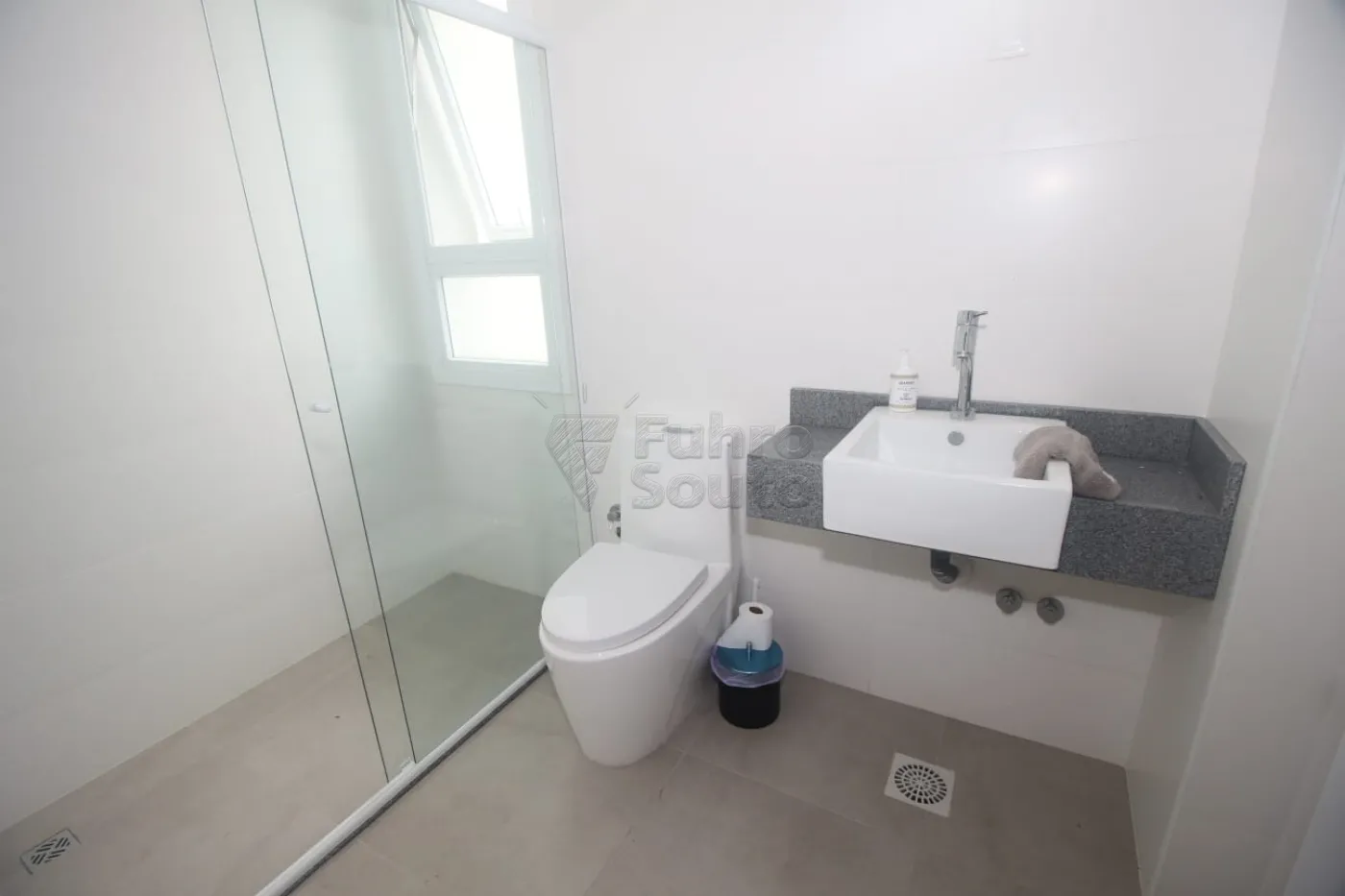 Banheiro com box de vidro: Funcional e com acabamento moderno.