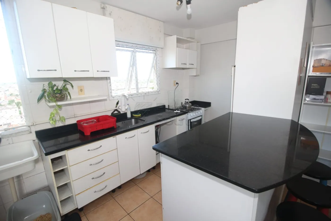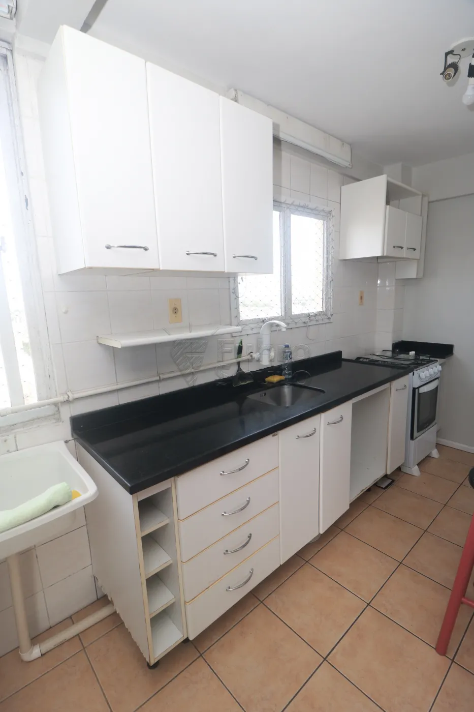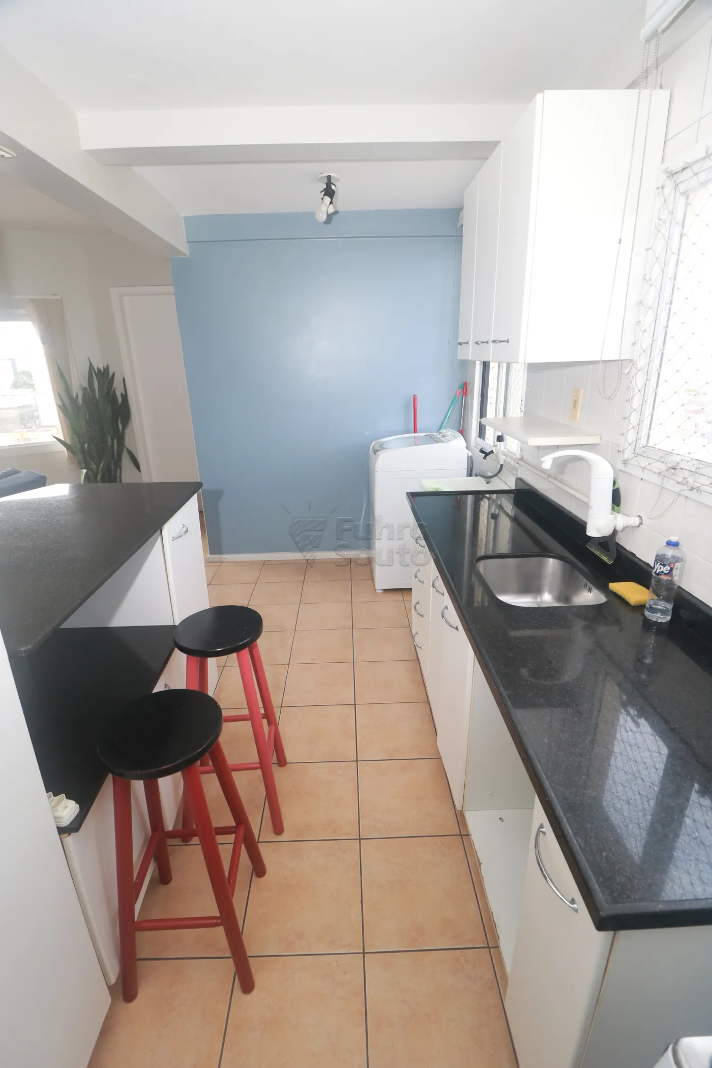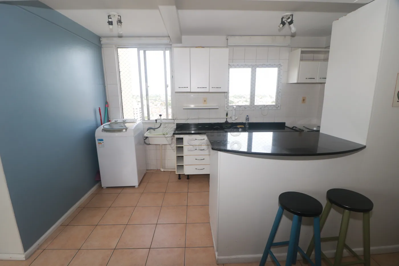 Cozinha completa: com armários, bancada em granito estilo americano com 4 banquetas, fogão e geladeira (micro-ondas será retirado).