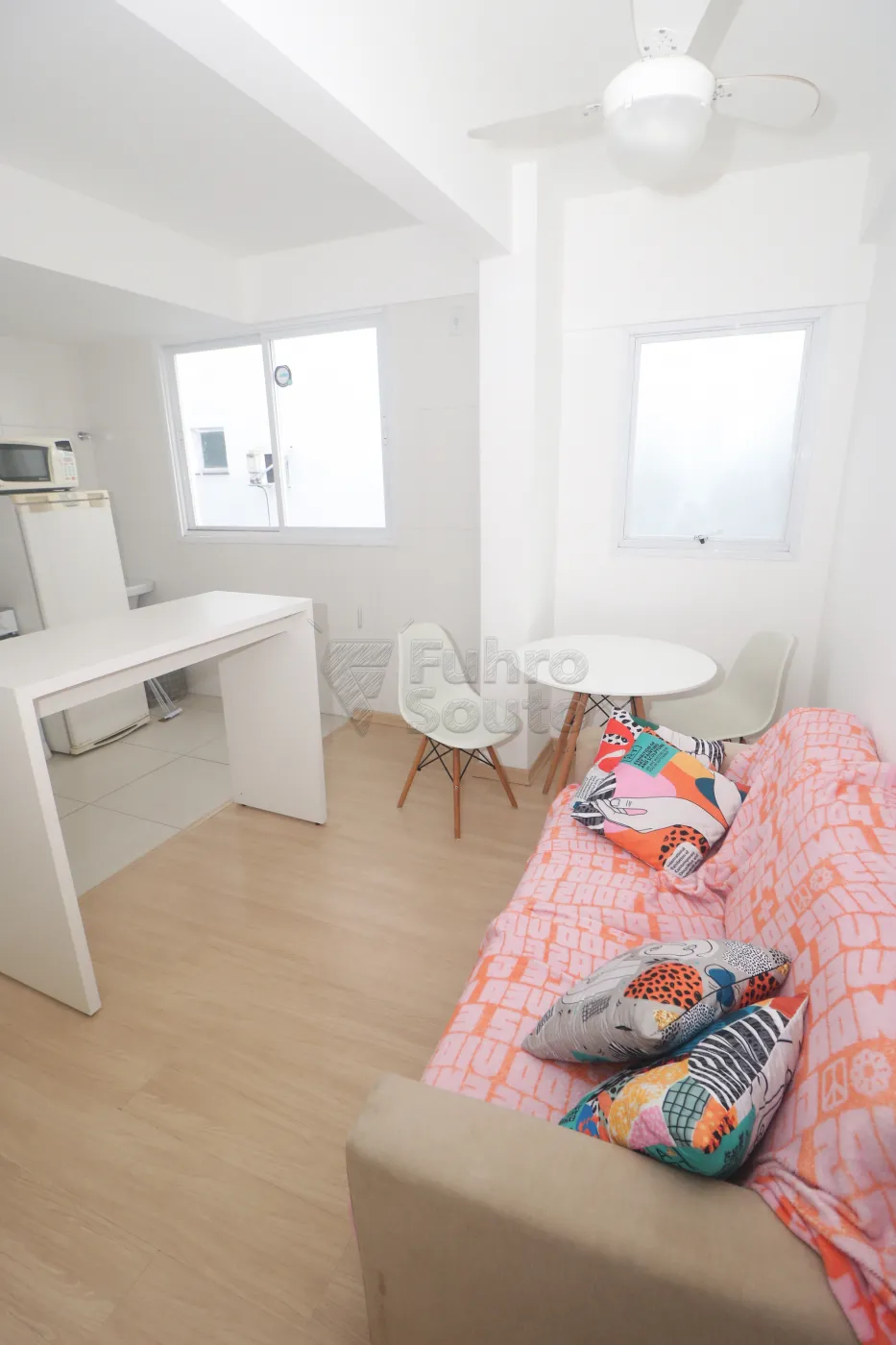 Sala e cozinha em conceito aberto: Ambientes integrados que ampliam o espaço e garantem praticidade no dia a dia, com balcão de pia na cozinha, armário aéreo, micro-ondas, geladeira, uma bancada que divide o ambiente, na sala tem um sofá e uma mesinha com cadeira, com ventilador de teto.