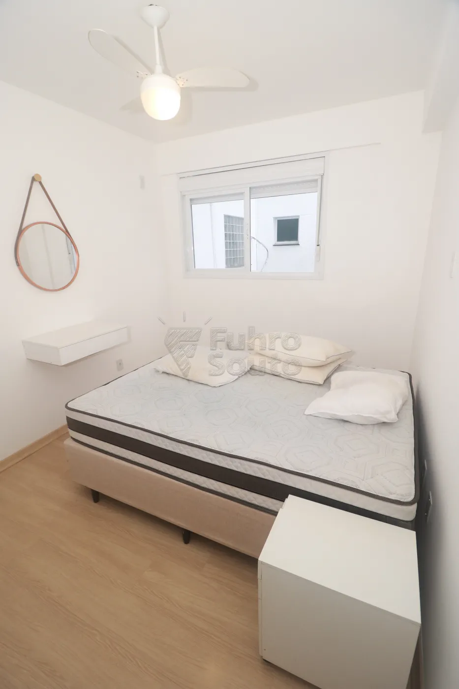 1 dormitório: Quarto bem iluminado com ventilador de teto, cama box e roupeiro, com espaço ideal para seu conforto.