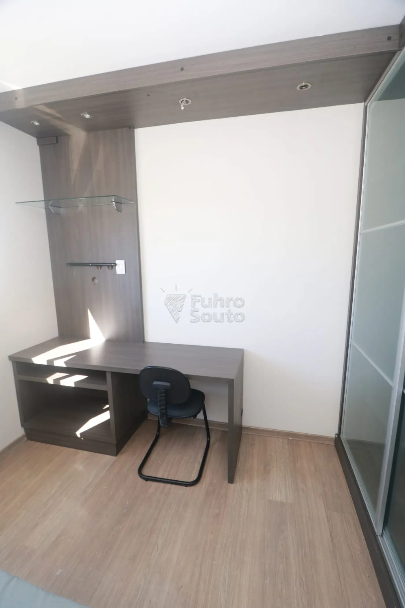 2 Dormitórios, sendo um com cama box solteiro, roupeiro, escrivaninha, painel com prateleiras e cadeira.