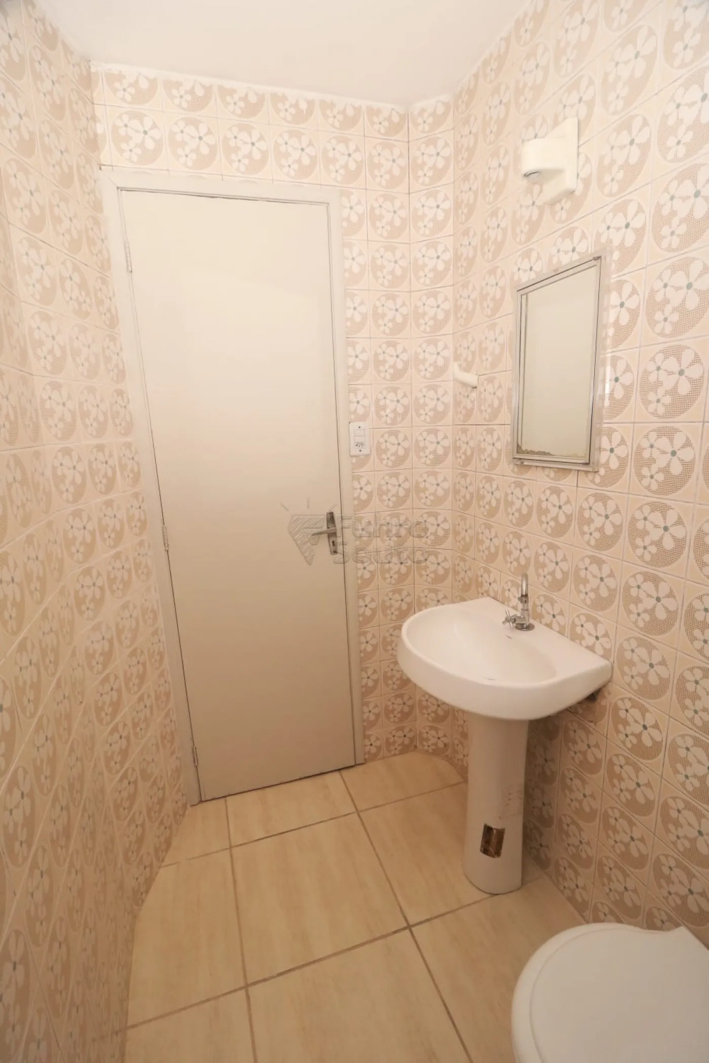 Banheiro social com revestimento cerâmico e boa iluminação.