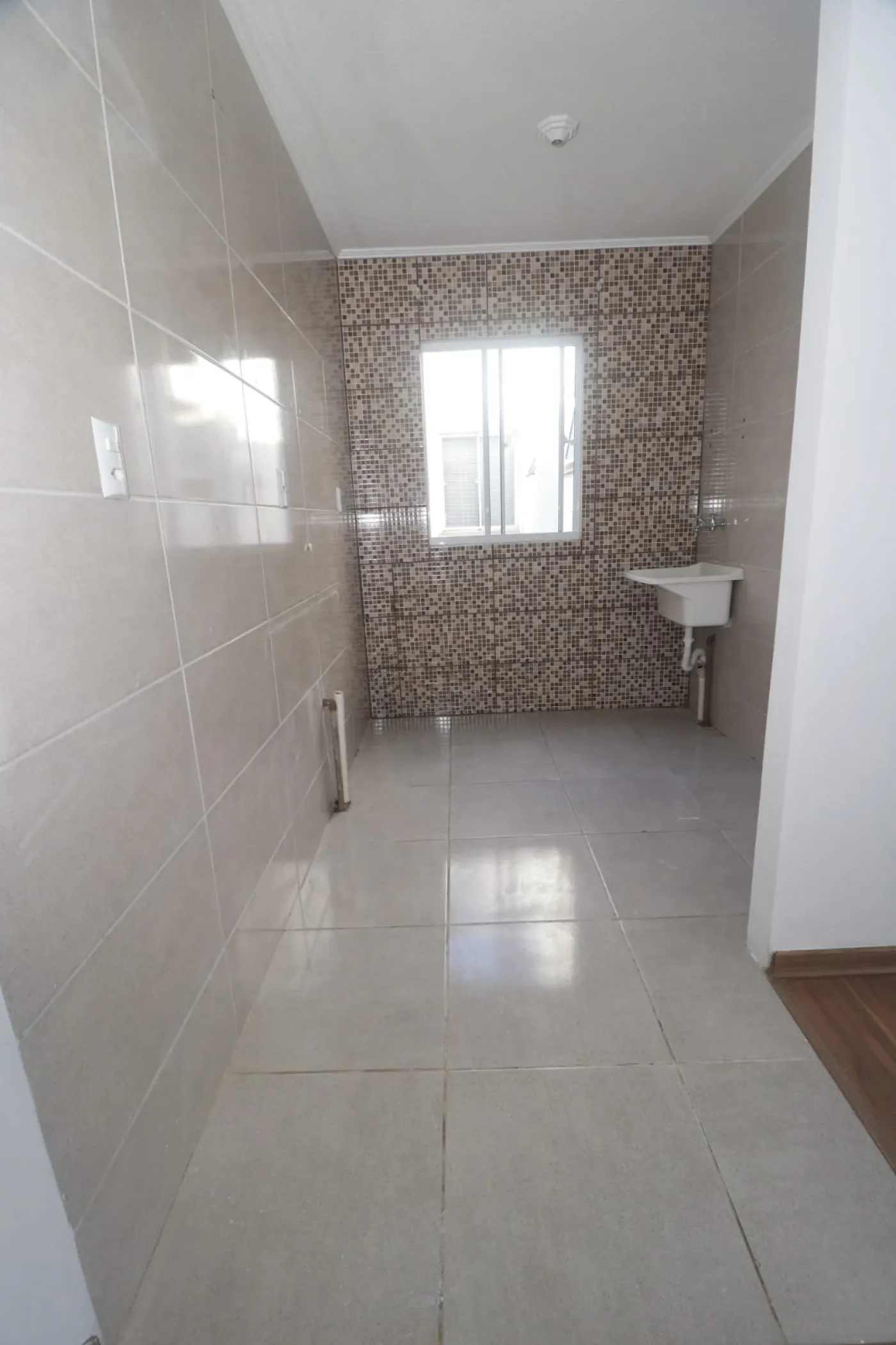 Cozinha funcional, com revestimento cerâmico, armário aéreo e balcão de pia.