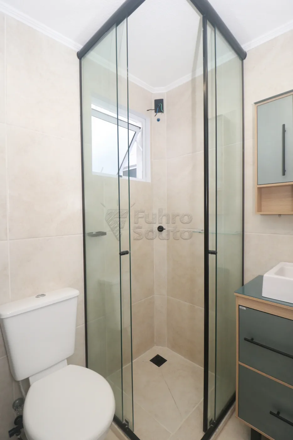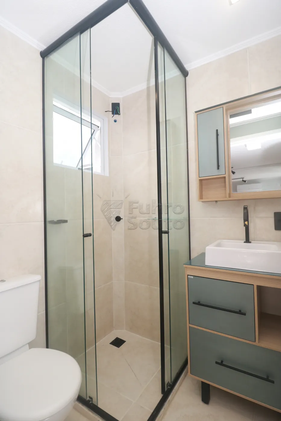 Banheiro - com box de vidro, armário com cuba e espelho, trazendo funcionalidade e bom aproveitamento do espaço