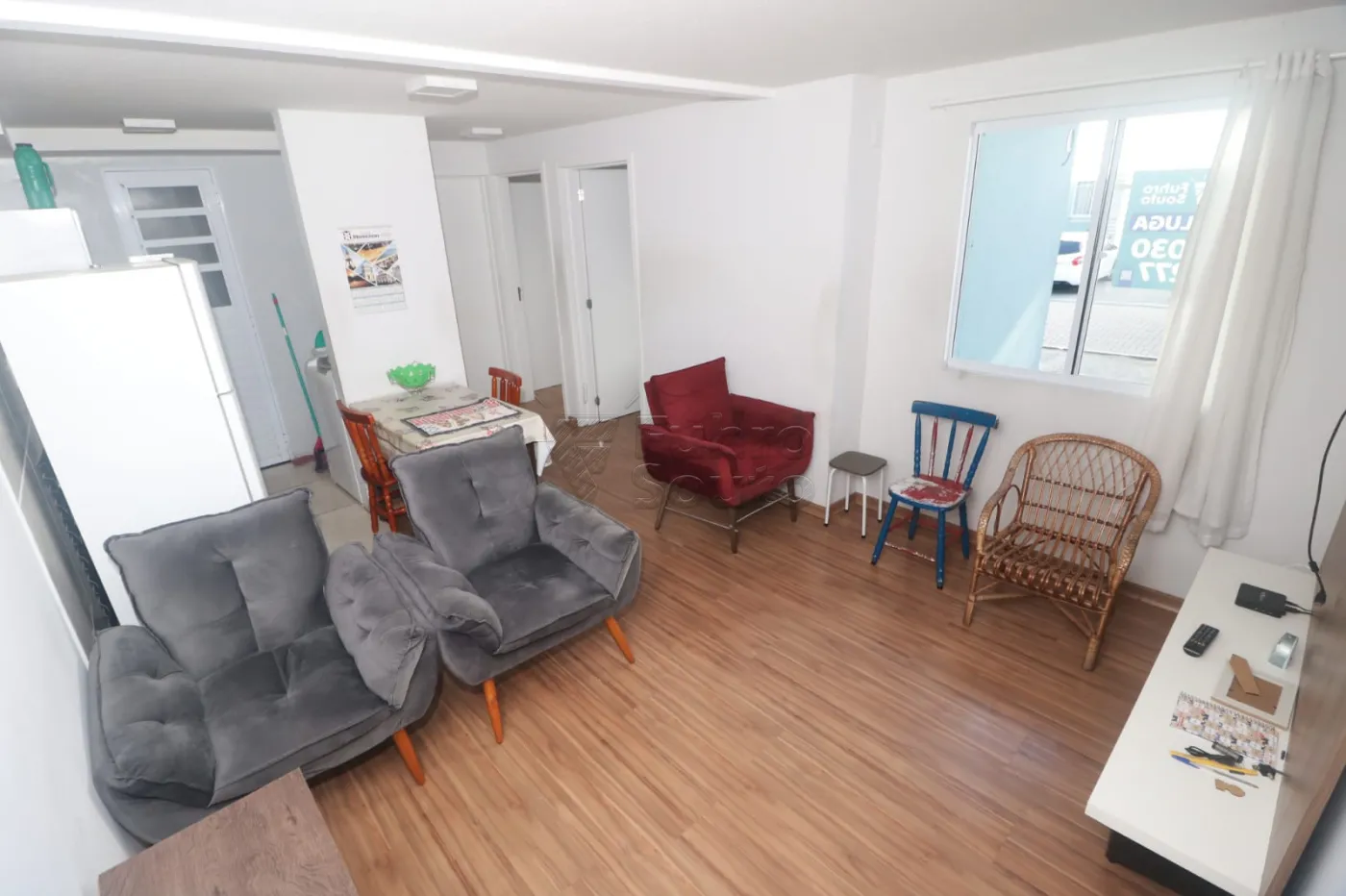 Ambiente confortável, com piso laminado que traz mais aconchego ao espaço. A sala já conta com poltronas para descanso, painel para televisão e rack, além de mesa de jantar com 4 cadeiras, criando um espaço ideal para refeições e momentos em família.