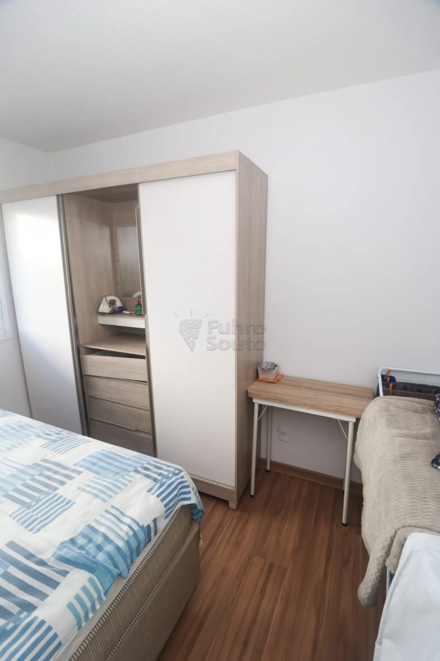 Quarto espaçoso e bem distribuído, mobiliado com cama, roupeiro para organização das roupas e mesa de apoio.
