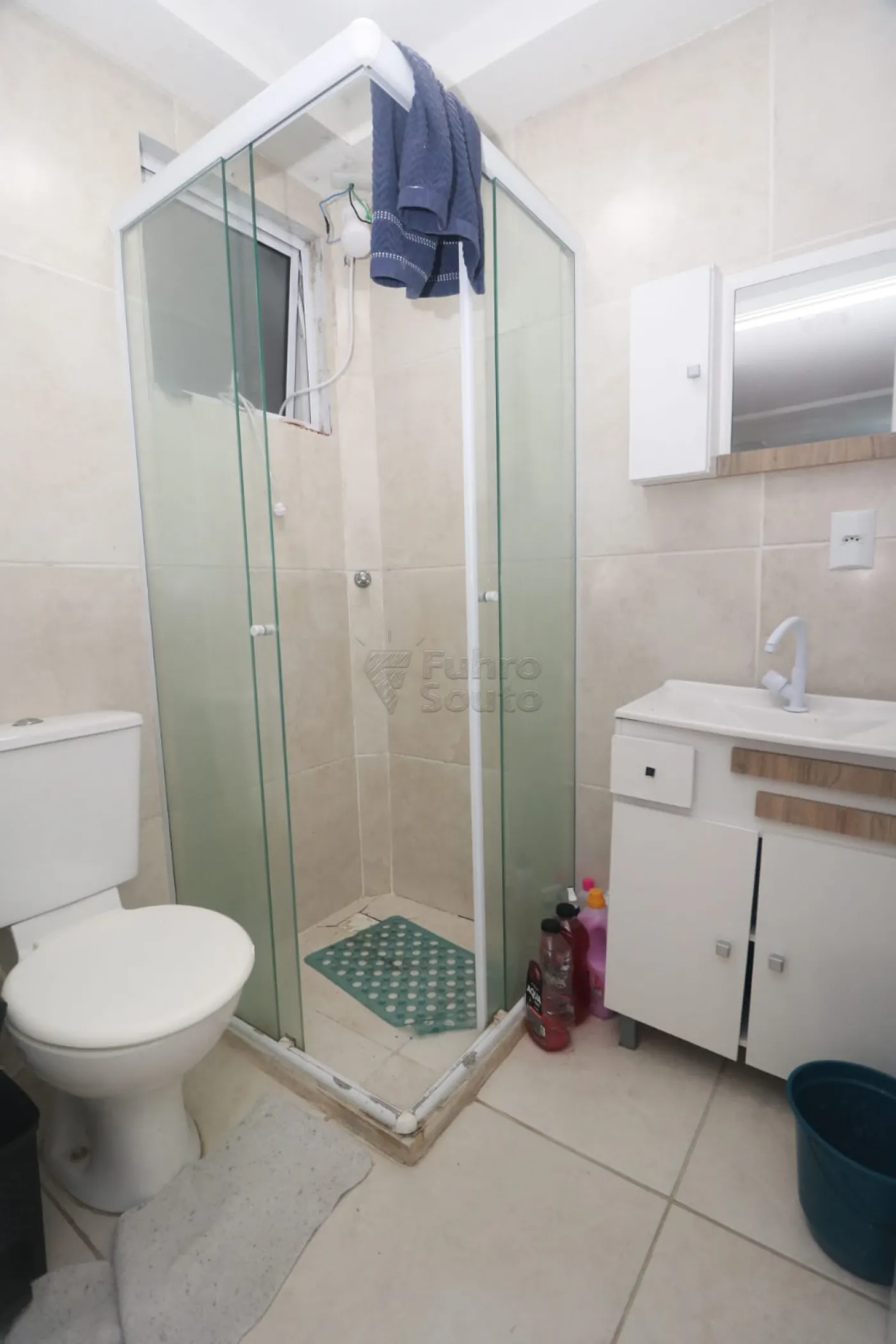 Banheiro completo, com box de vidro e armário com espelho, oferecendo praticidade e organização.