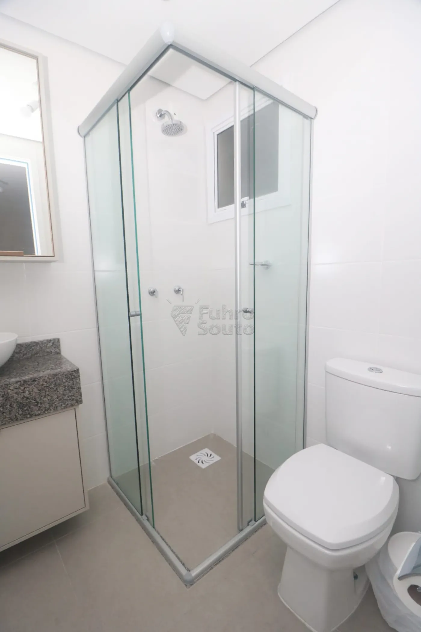 Banheiro social: Equipado com armário e espelho, oferecendo mais organização ao ambiente.
