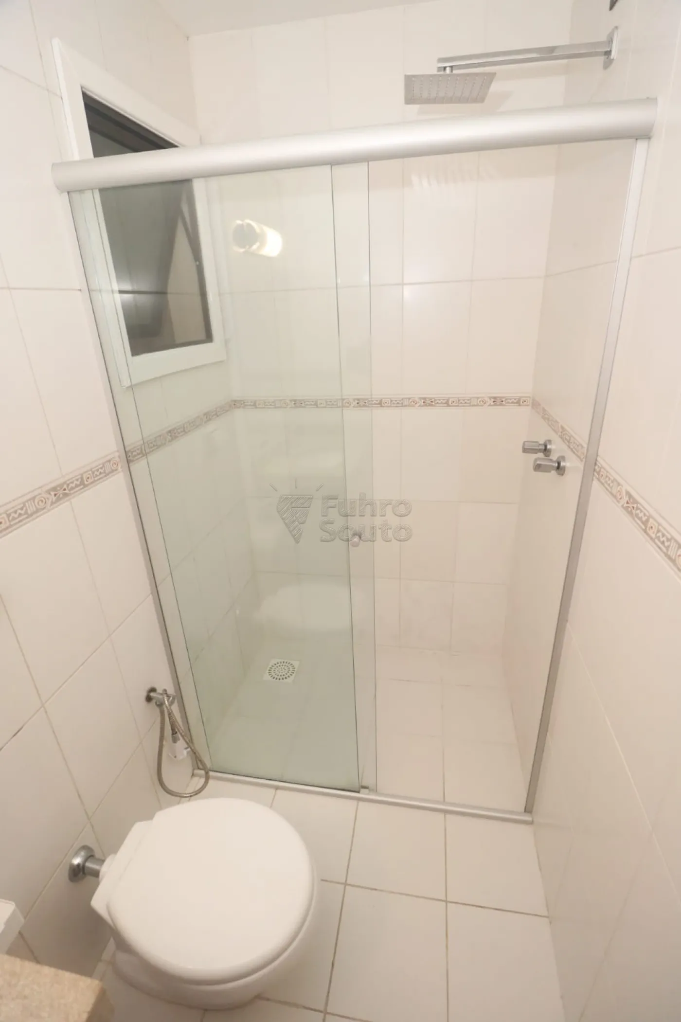 Banheiro Social: Com box de vidro e armários.