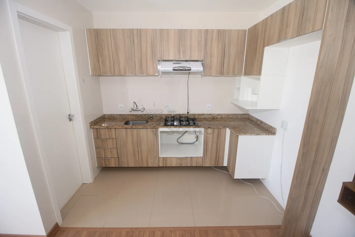 Cozinha equipada com armários planejados, fogão e depurador.