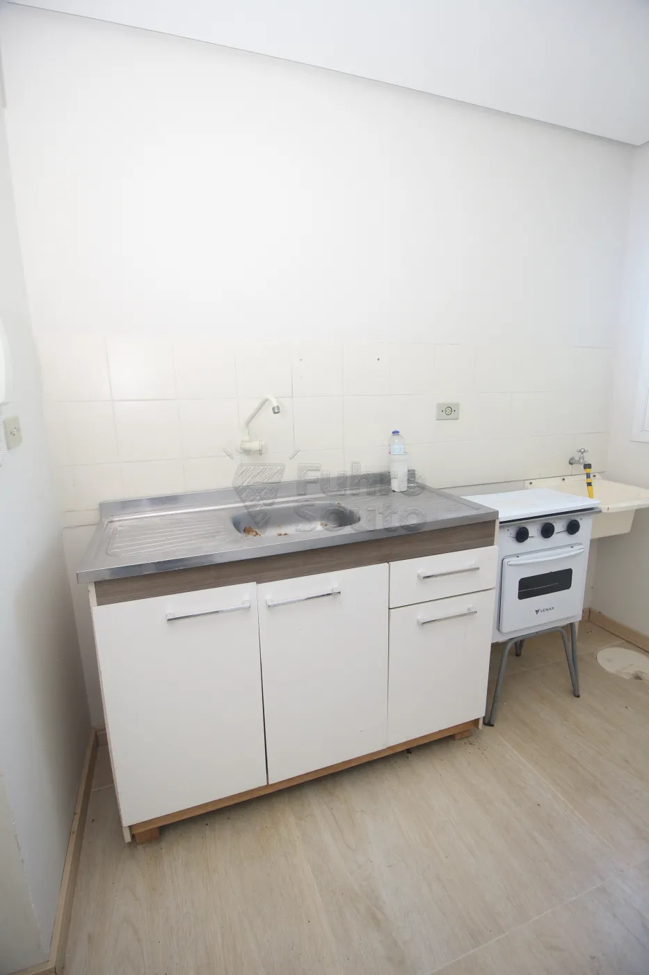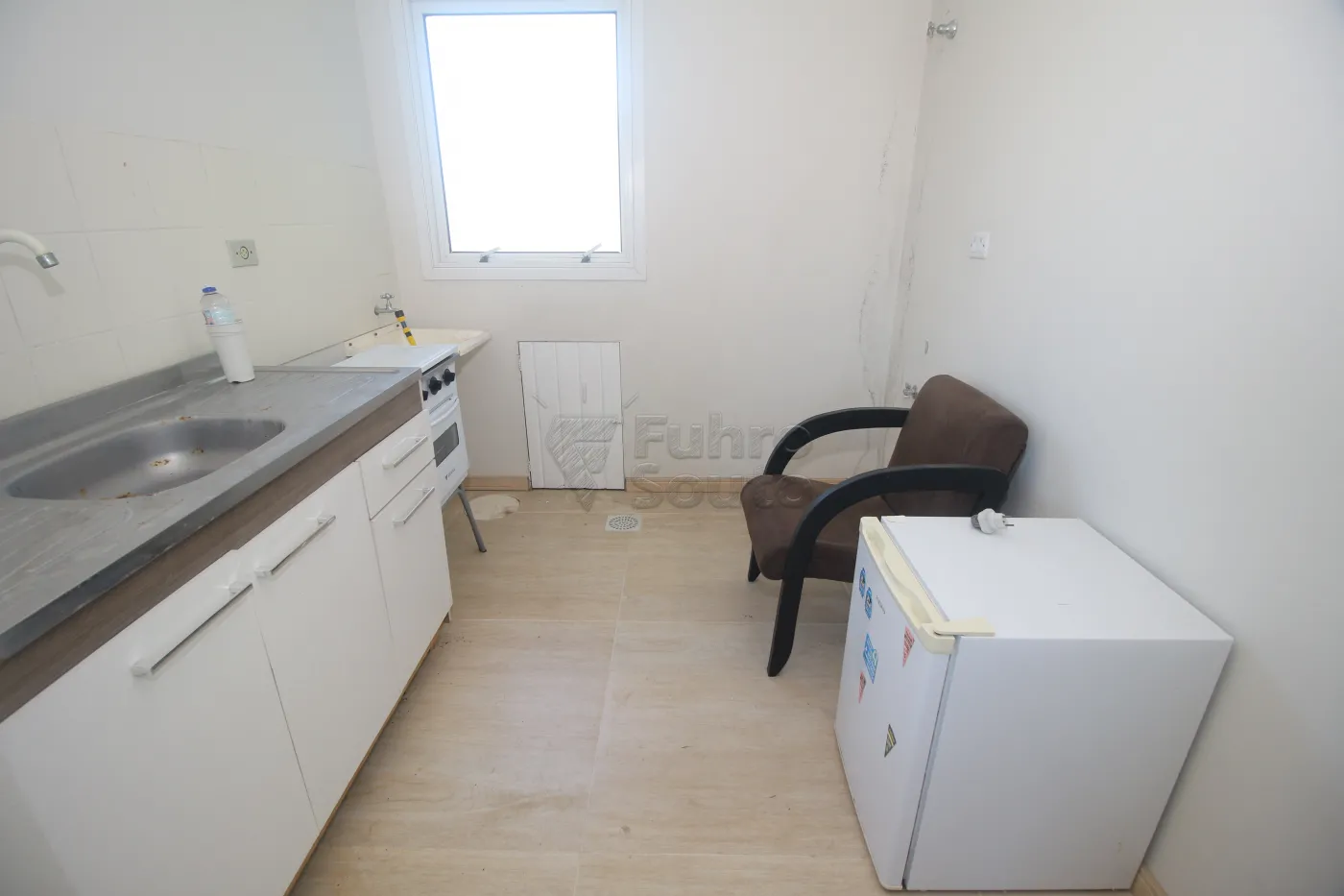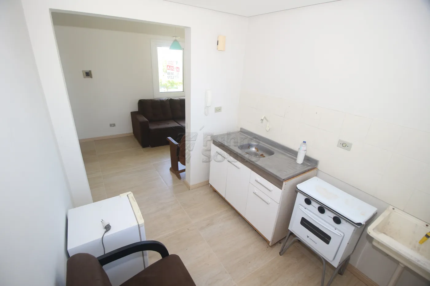 Cozinha funcional, equipada com balcão de pia, fogão e frigobar.