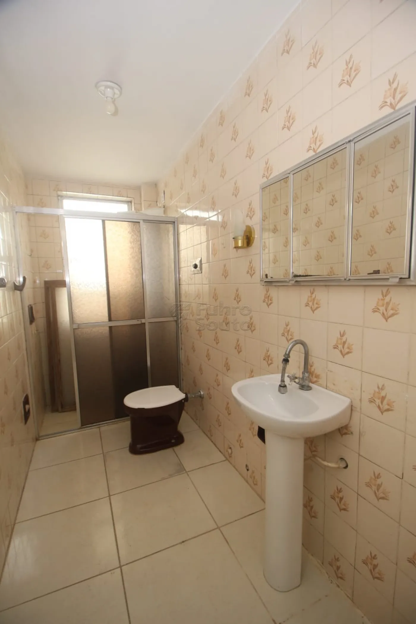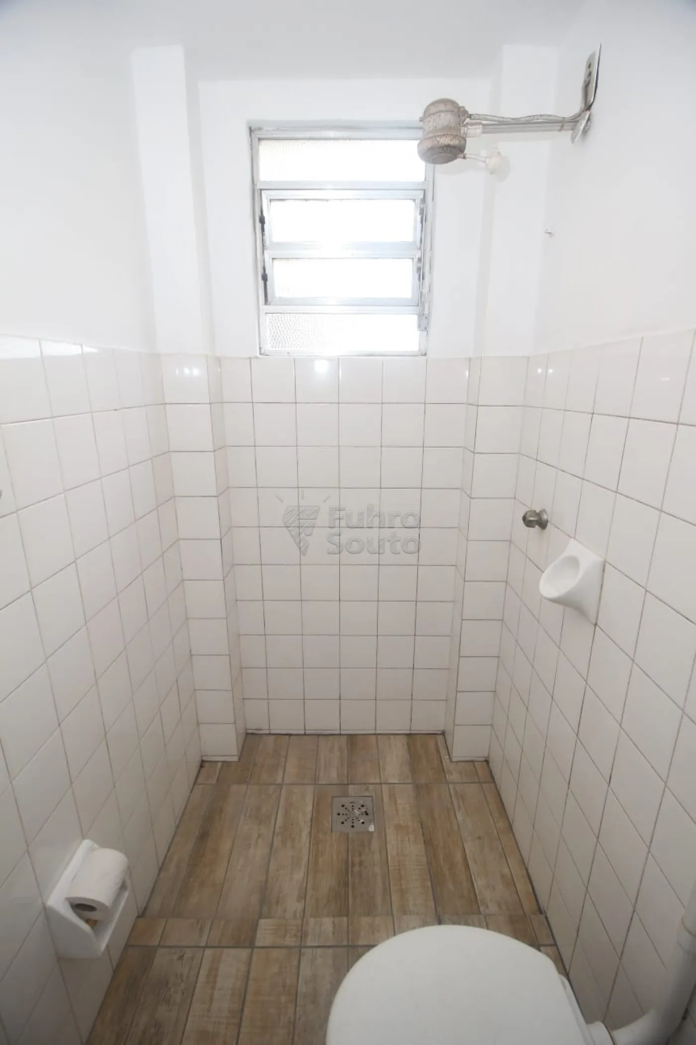 Banheiro social com box de vidro e ventilação natural.