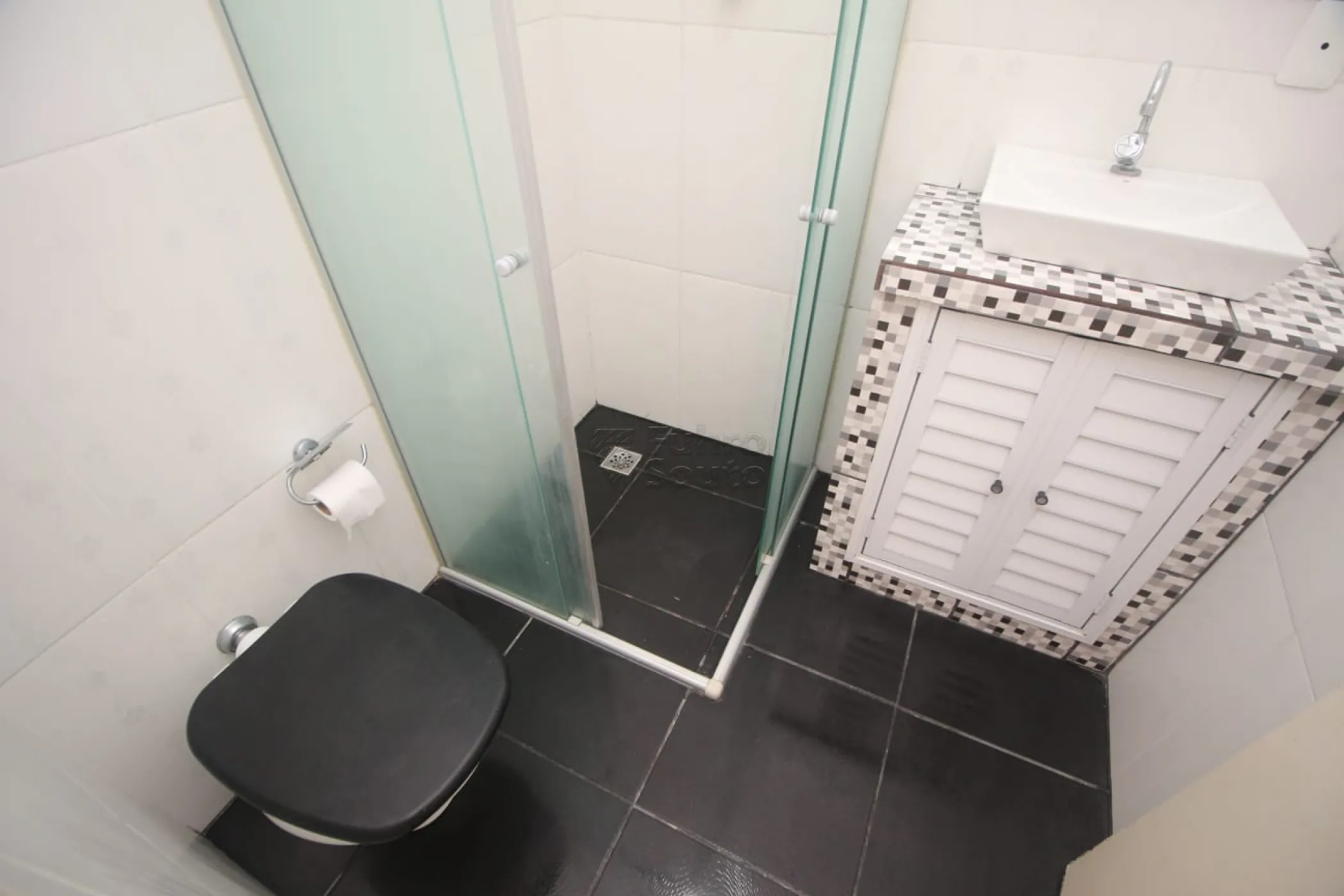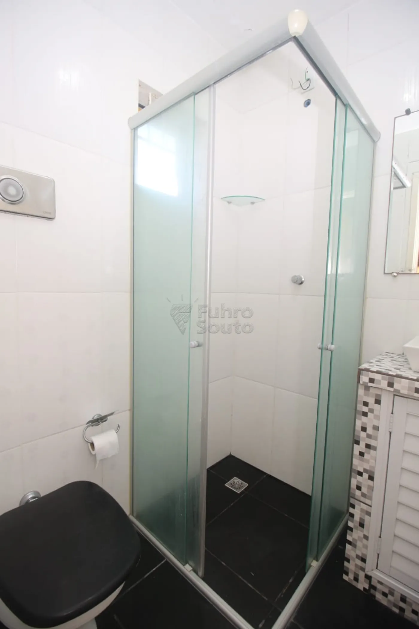 Banheiro com box de vidro e piso frio;