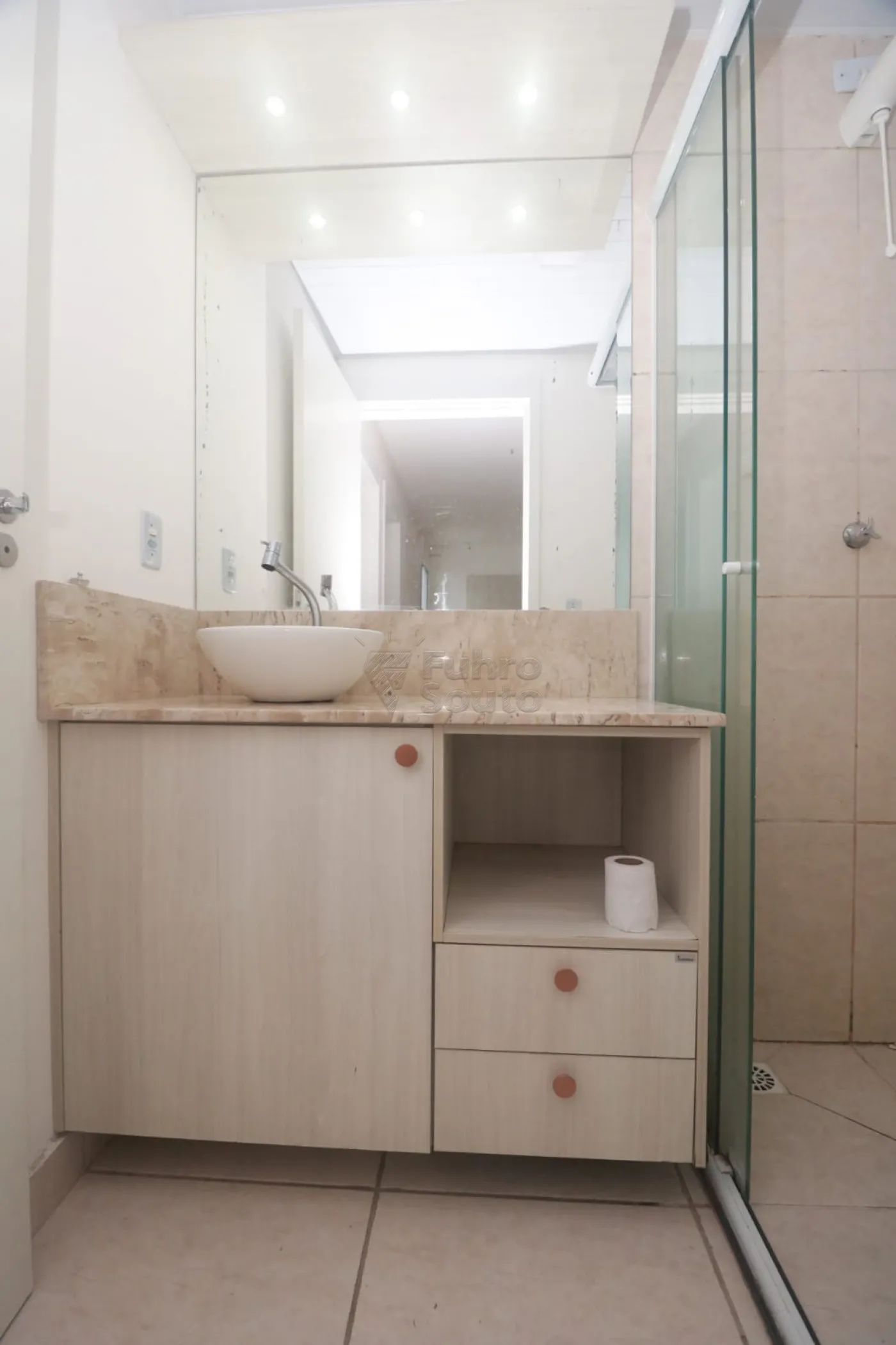 - Banheiro: completo, com box de vidro, armário planejado com cuba e espelho.