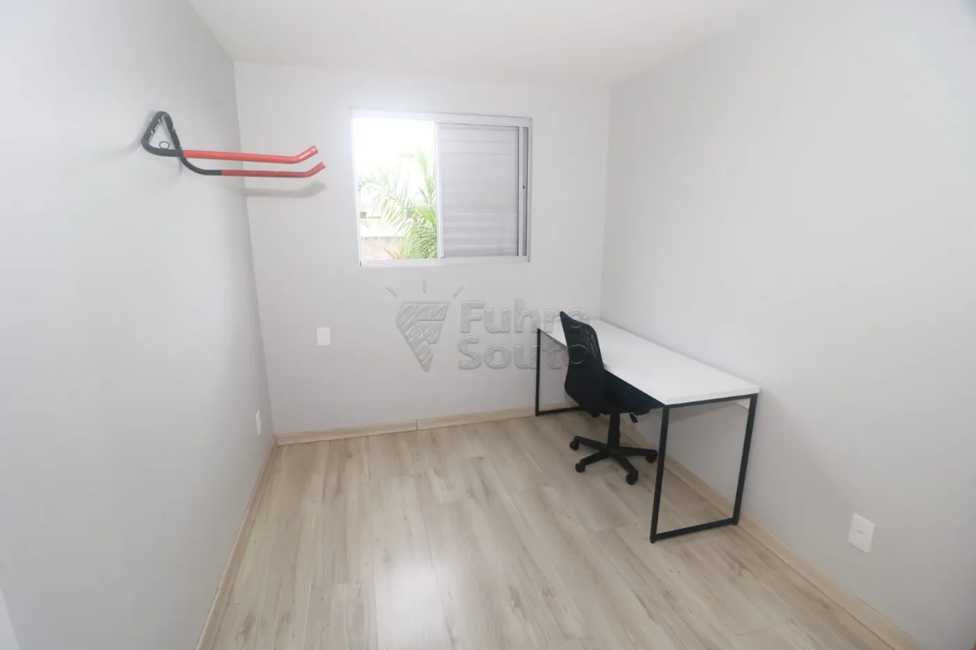 Segundo quarto versátil com escrivaninha, ideal para home office, e suporte de parede para bicicleta