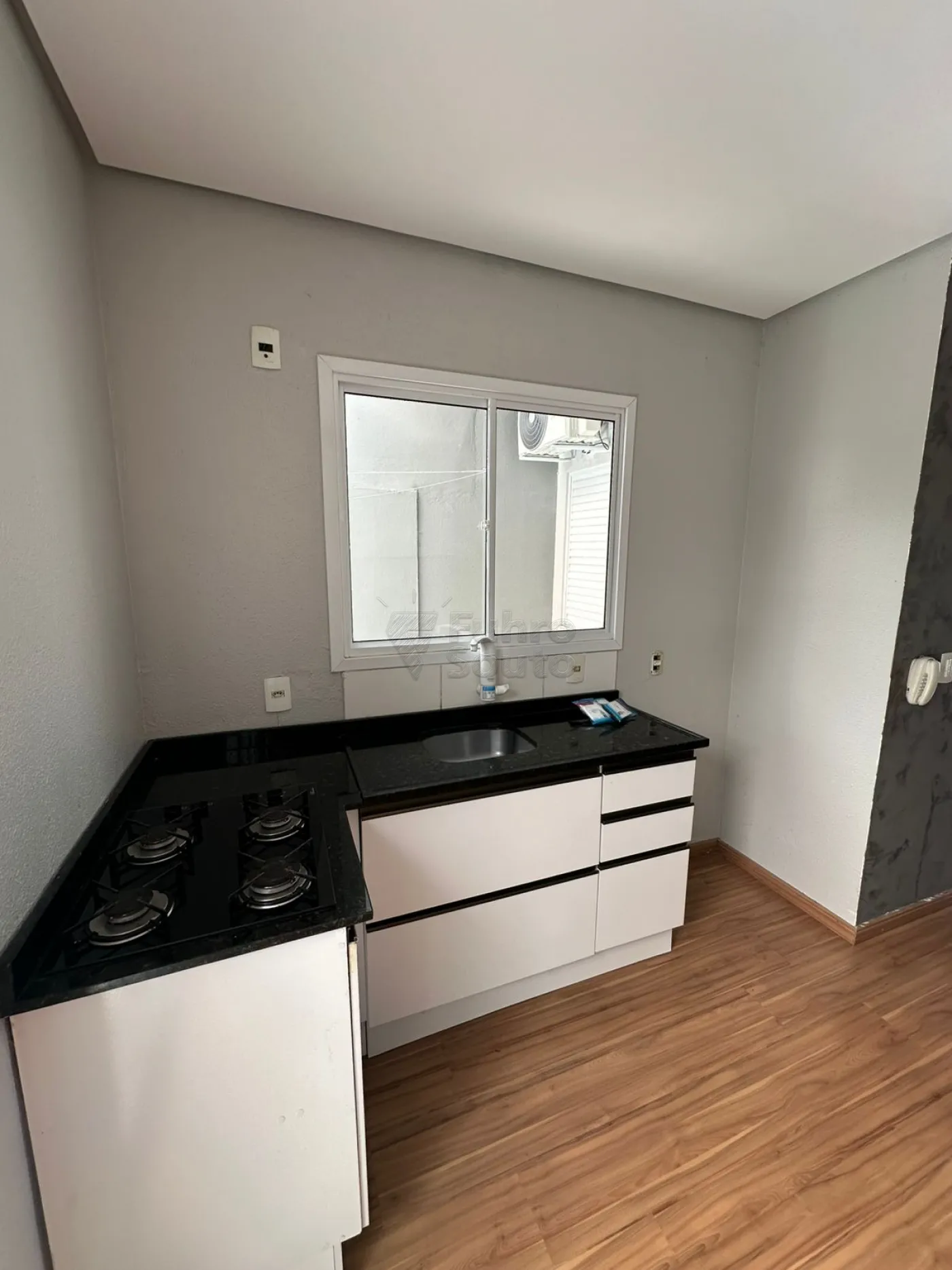 Cozinha Planejada: Fica completa! Móveis sob medida em tons de branco e preto, com bancada em granito escuro e cooktop embutido.