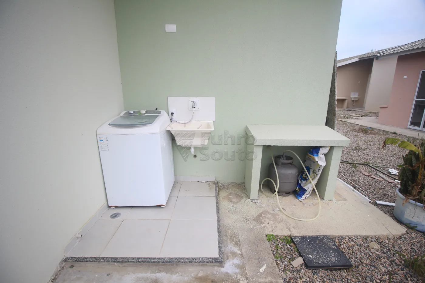 Área de serviço com tanque e máquina de lavar.