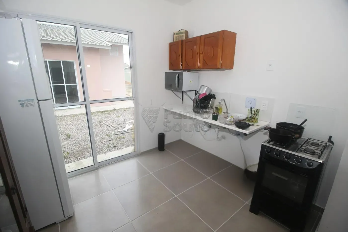 Cozinha integrada a sala, com geladeira, micro-ondas, pia e armário, em um ambiente amplo e funcional, perfeita para quem gosta de cozinhar, com espaço para refeições e muita luminosidade, com portas-janelas que se abrem para o exterior.