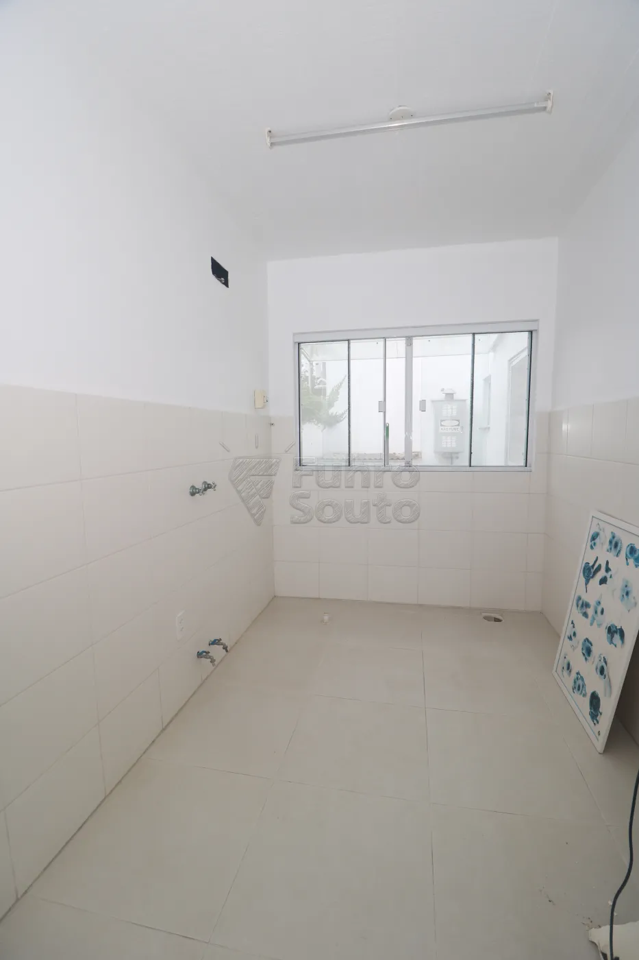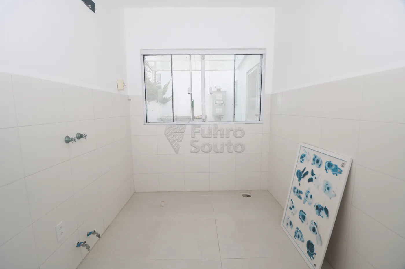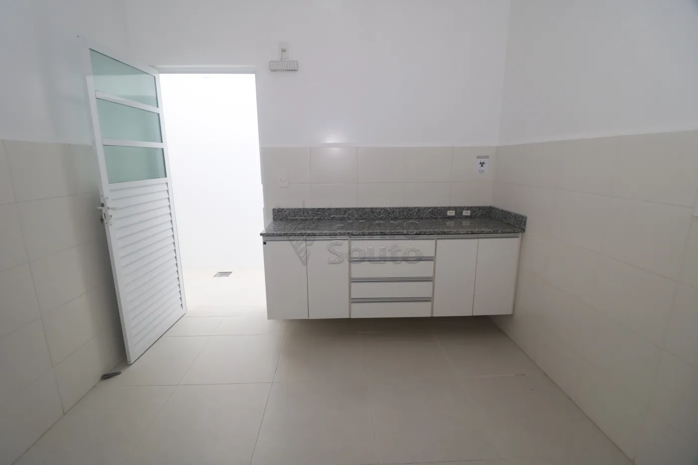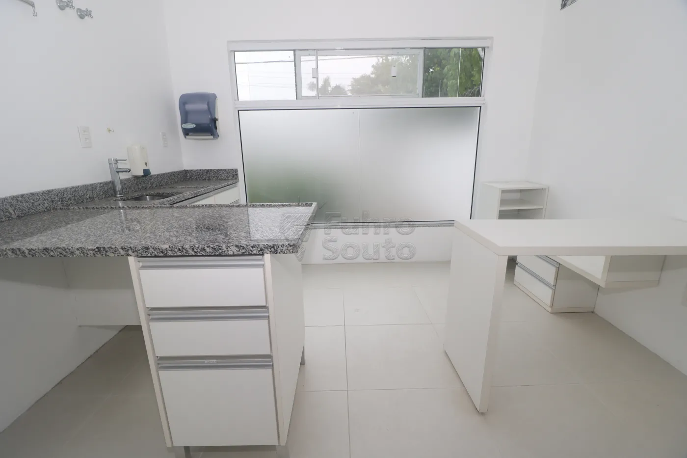 Sala 4 - destinada a atividades úmidas (banho e tosa), com instalação de água quente e fria, bancada em granito com nicho para toalhas, janelas com tela e espera para split