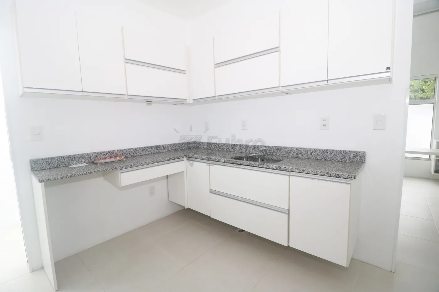 Sala 3 - sala ampla com bancada em granito polido, cuba, armários, armários aéreos, janela com tela e espera para split