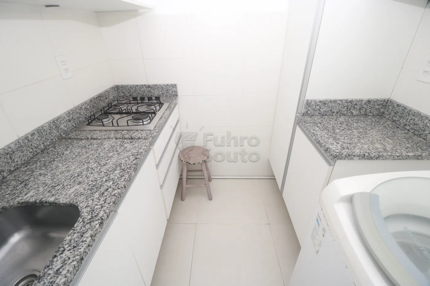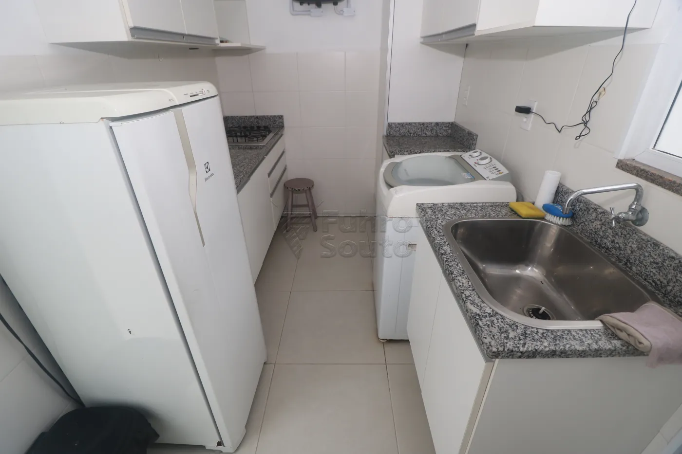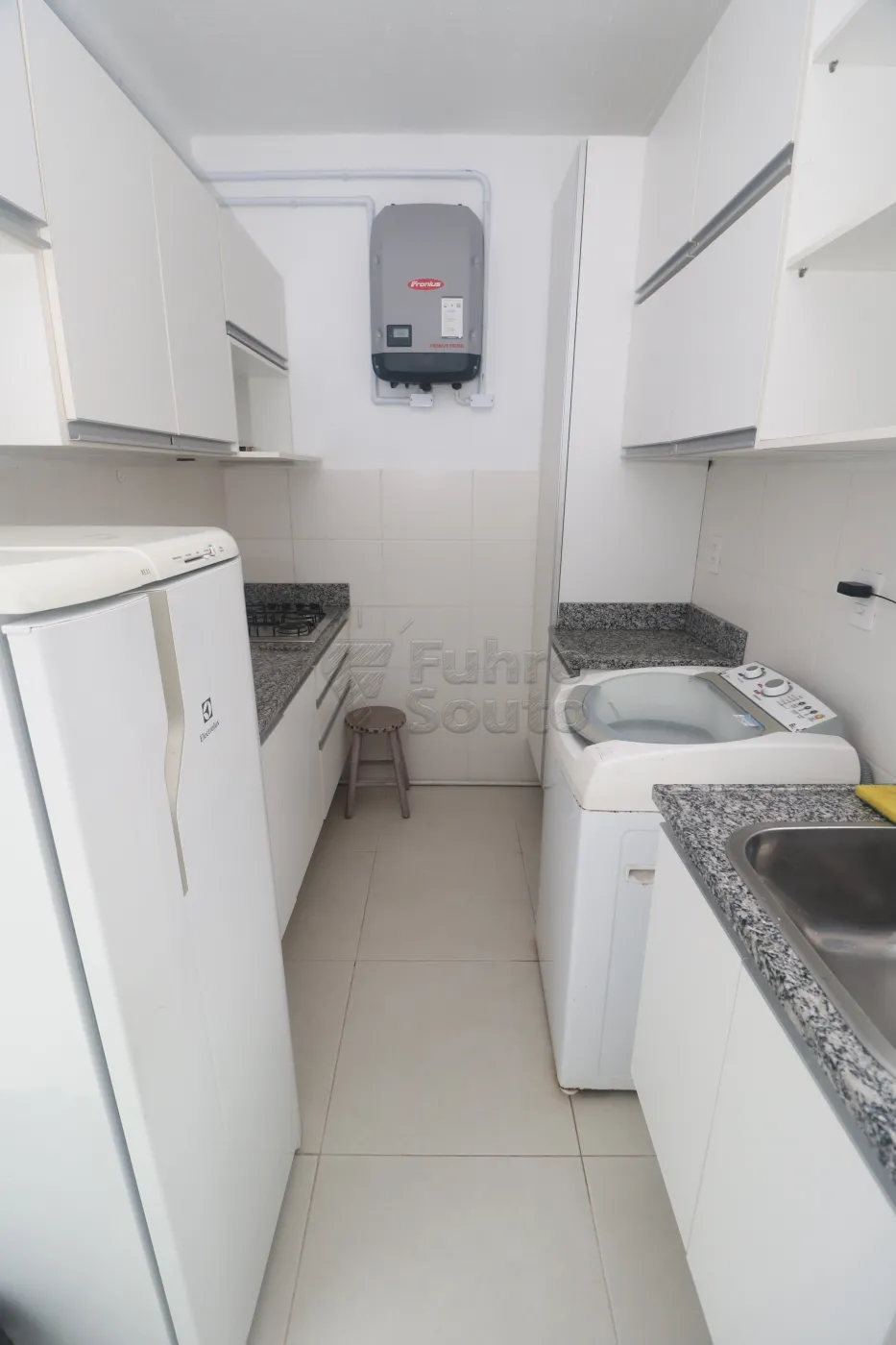 Copa / lavanderia - com bancada em granito polido, cuba e armário, cooktop, geladeira, armários aéreos, nicho para máquina de lavar Consul 8kg, tanque inox com armário e armário para equipamentos de limpeza e uniformes