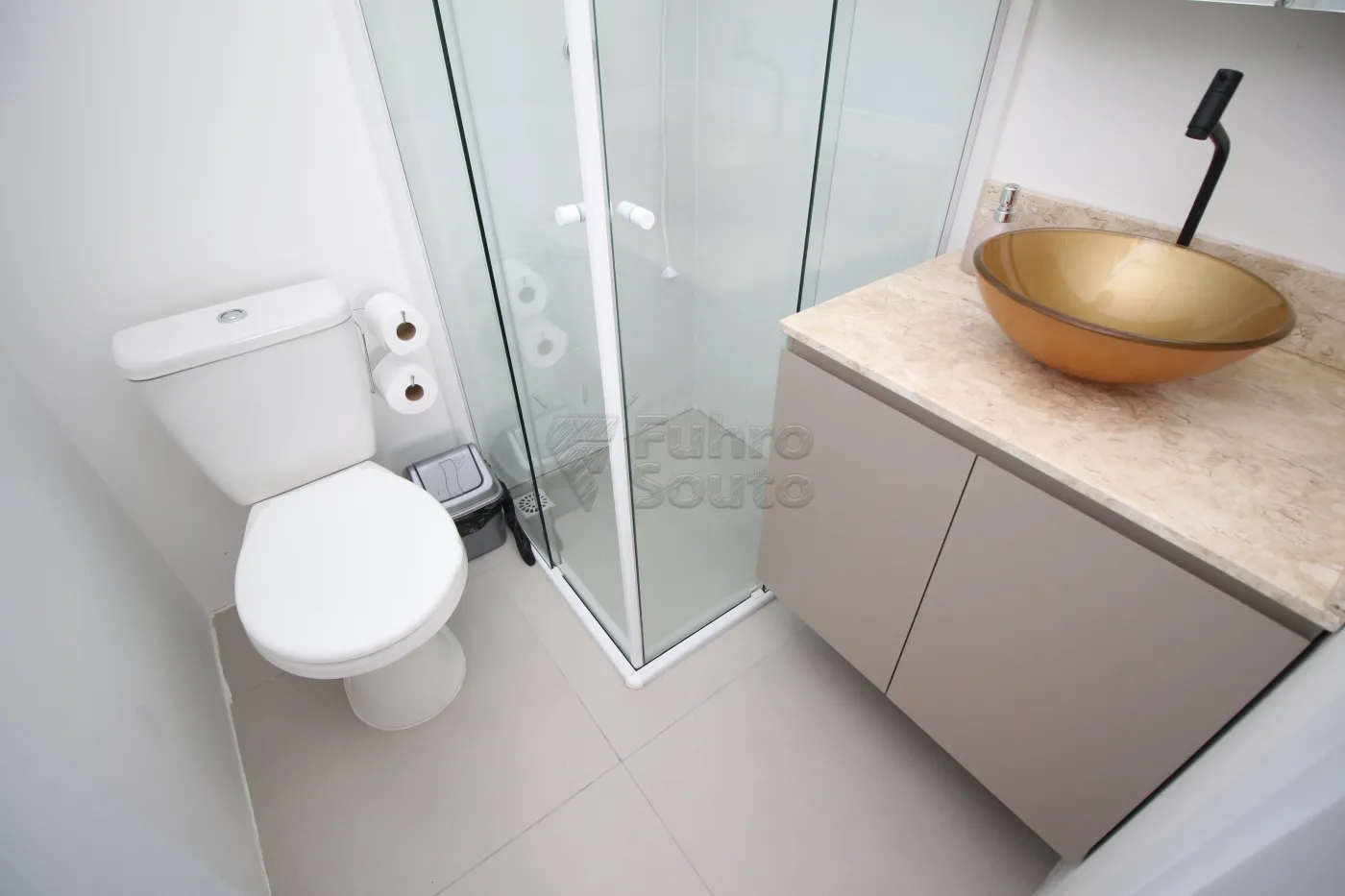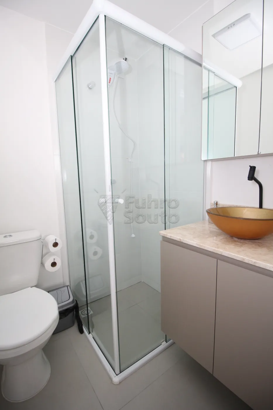 Banheiro elegante: Conta com box de vidro, trazendo modernidade ao ambiente.