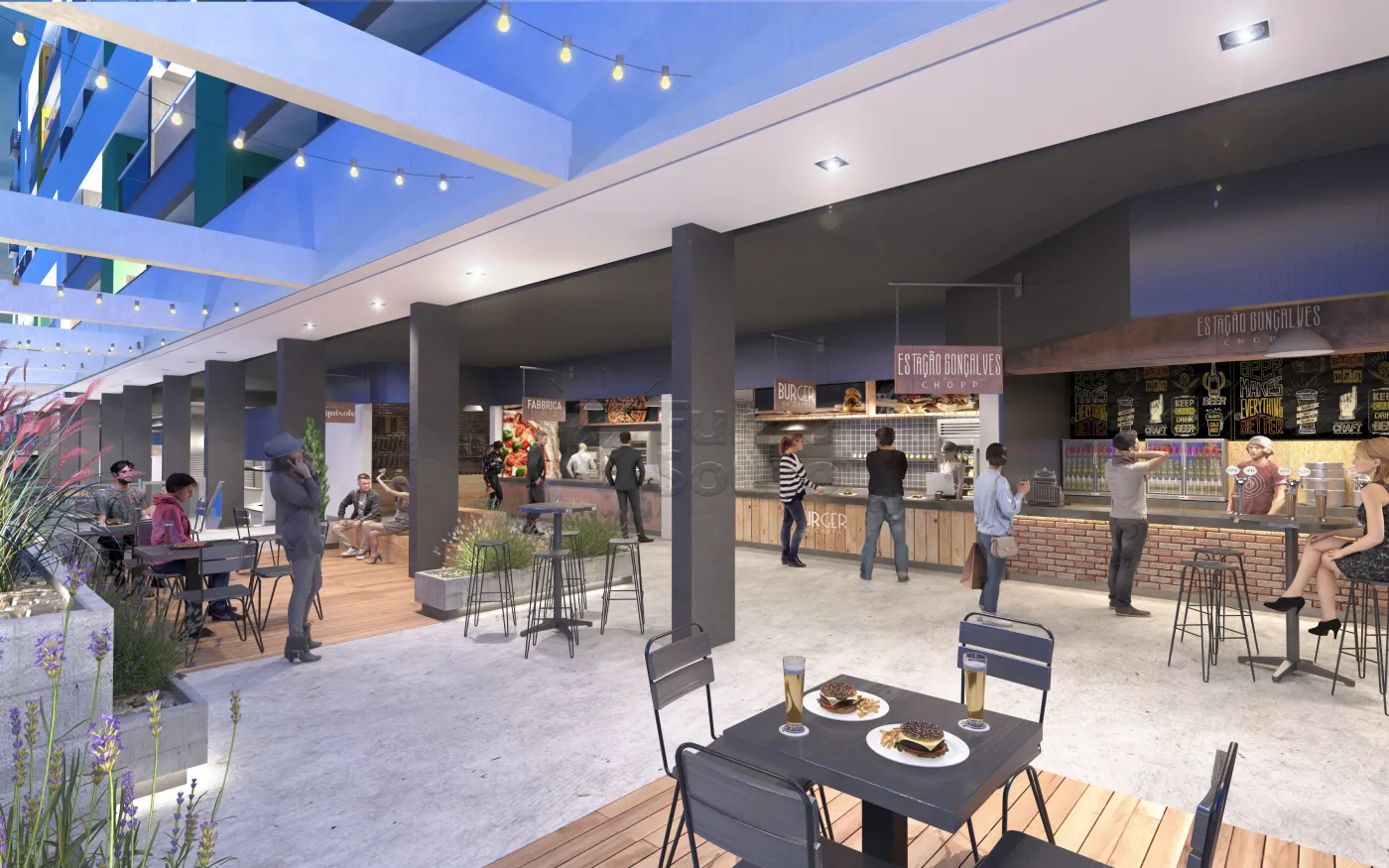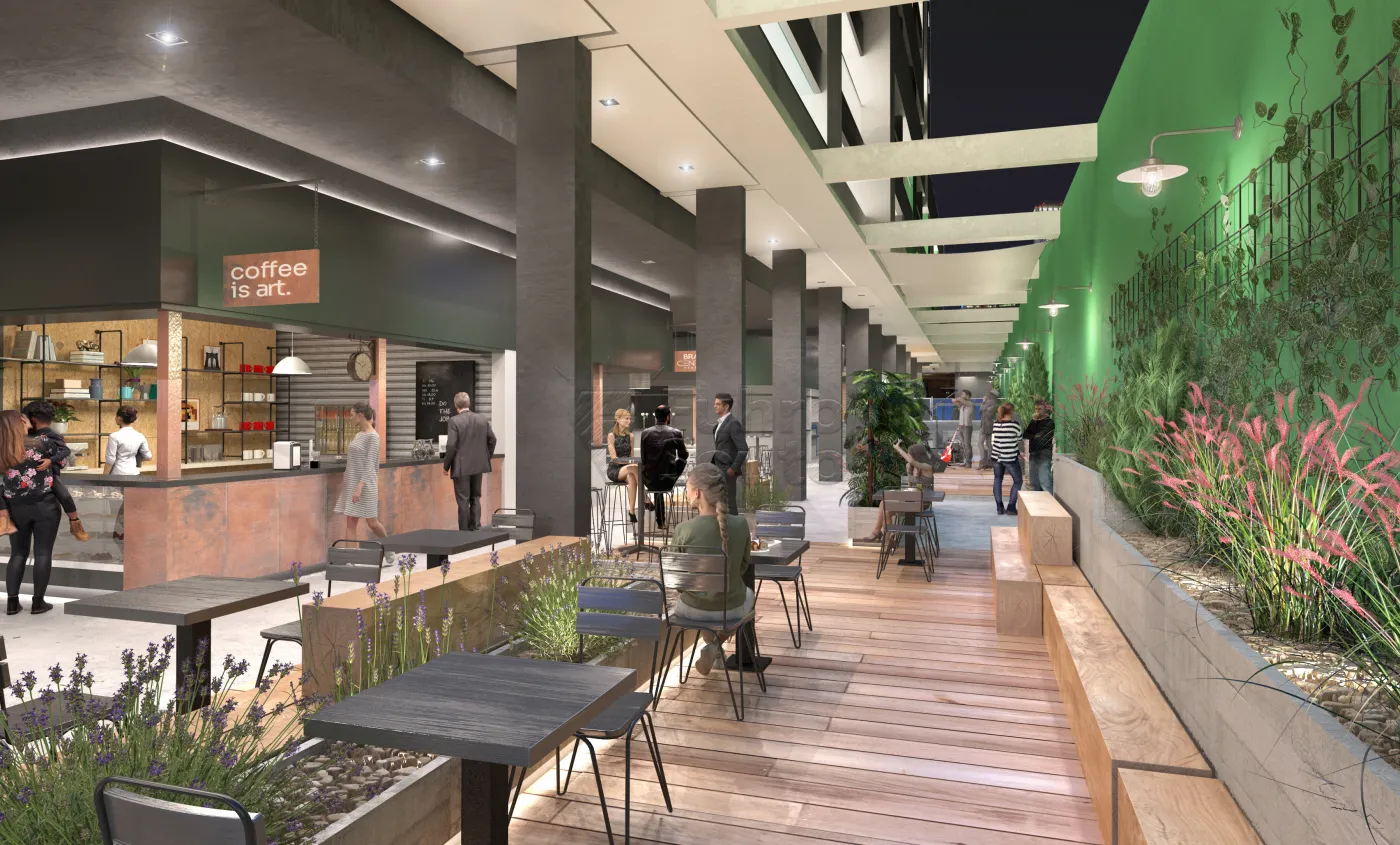 Ambiente agradável com diversas lojas no saguão do prédio.