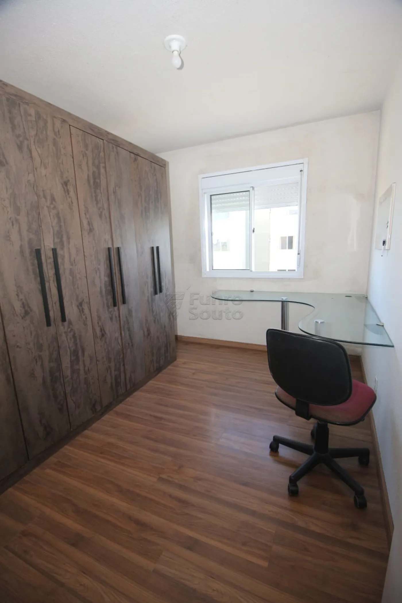 O segundo quarto conta com roupeiro, mesa de estudos e cadeira, ideal para quem precisa de um espaço para trabalho ou estudos.