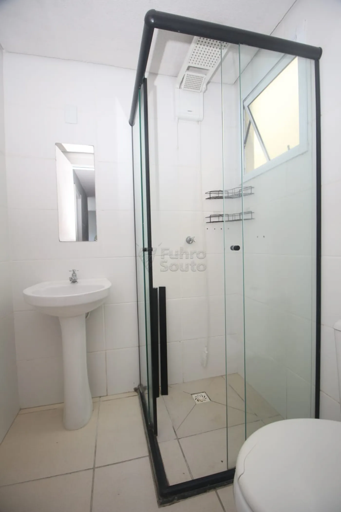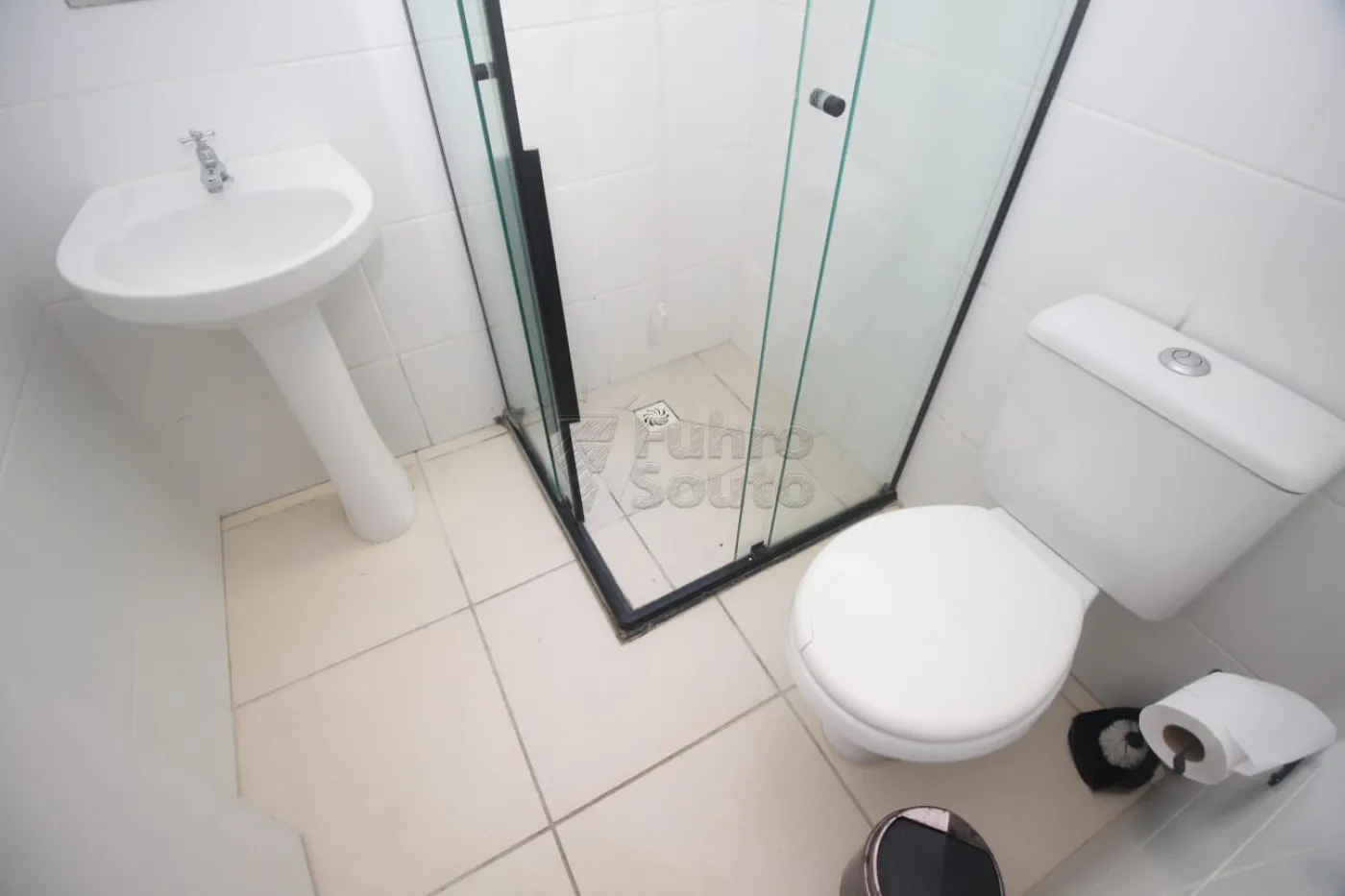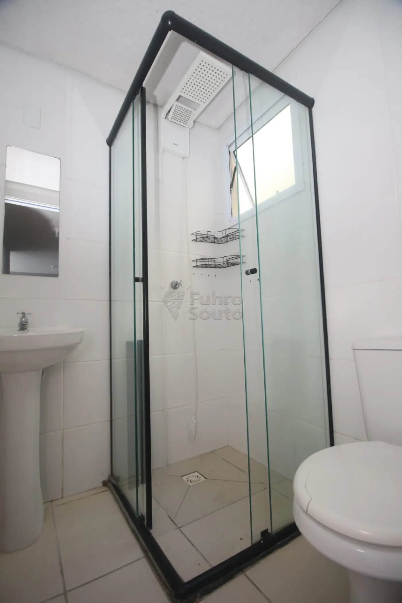Banheiro com box em vidro, oferecendo praticidade e bom acabamento.