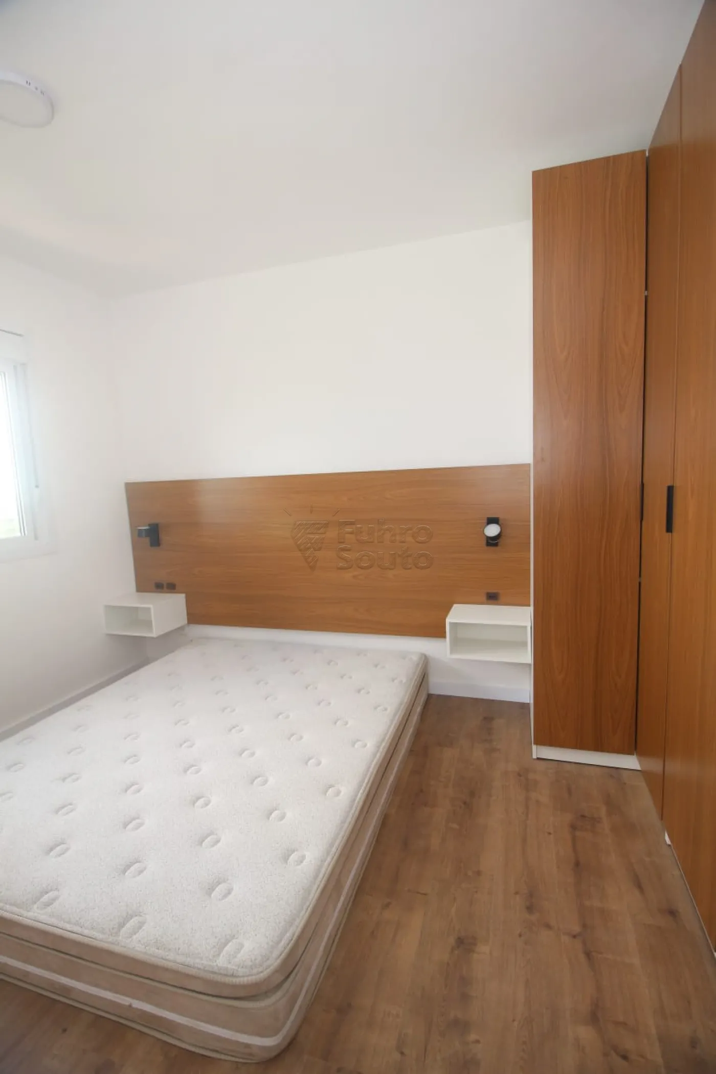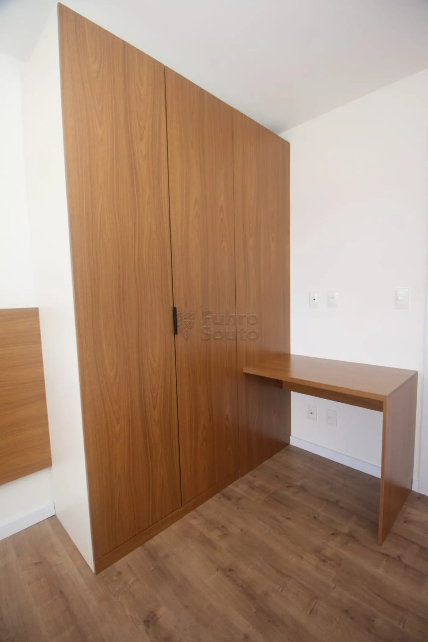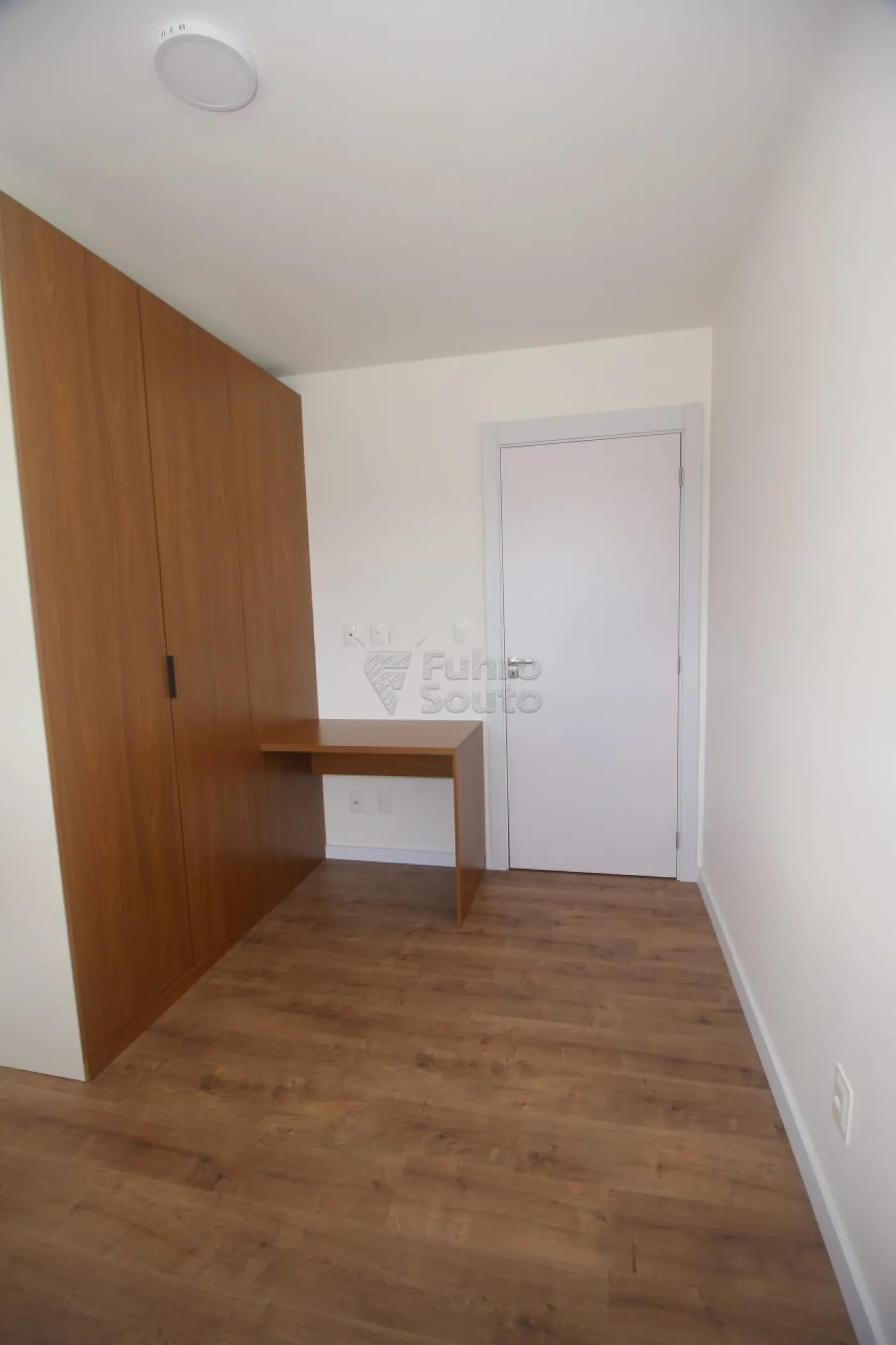 Segundo quarto com armário planejado, bancada de estudos e mesa de cabeceira.